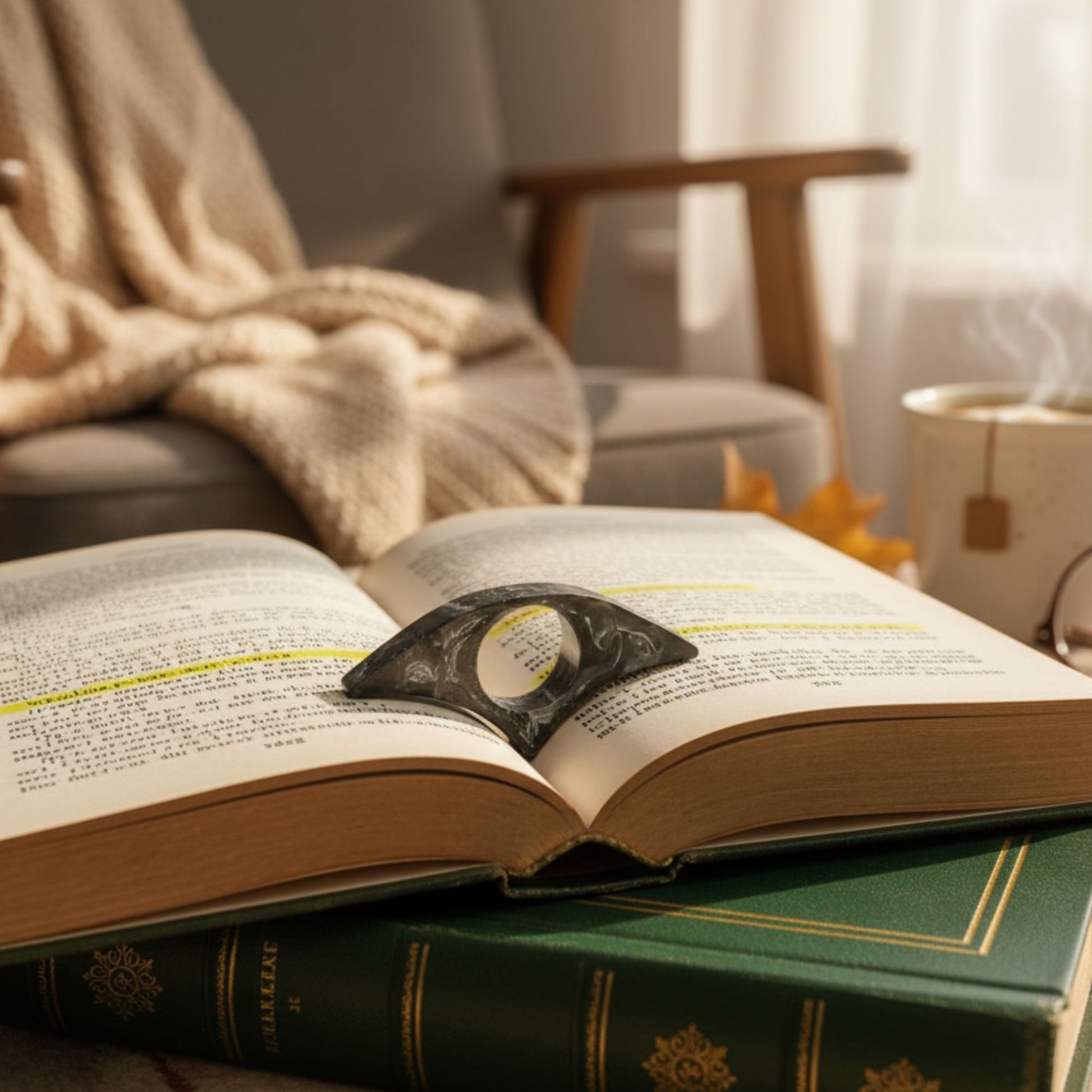 Enfilez simplement la bague sur votre pouce et glissez les pages de votre livre sous l'anneau. La bague maintient le livre ouvert et vous permet de lire confortablement d'une seule main, que vous soyez dans le canapé, dans les transports ou au lit. Fini les livres qui se referment !