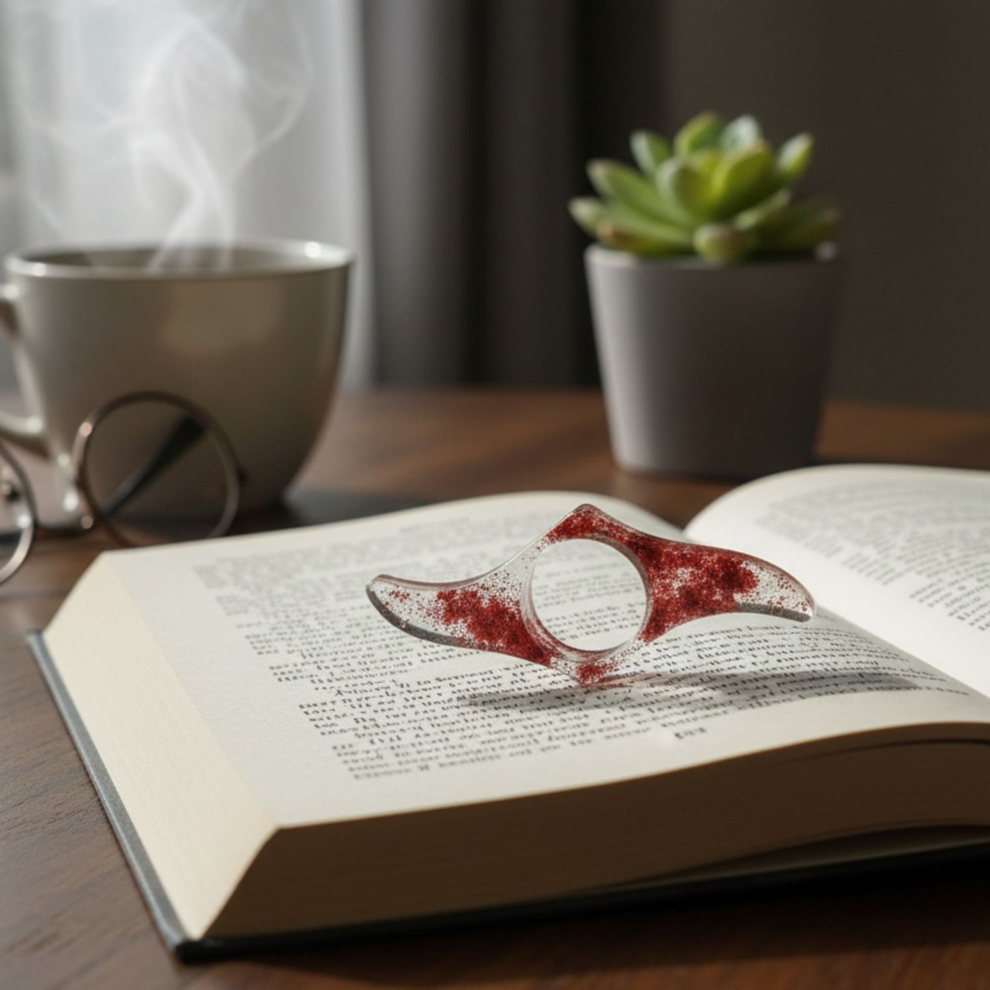 Illuminez vos moments de lecture avec cette bague de lecture ailée en résine aux reflets rouges pailletés, entièrement faite main dans mon atelier.