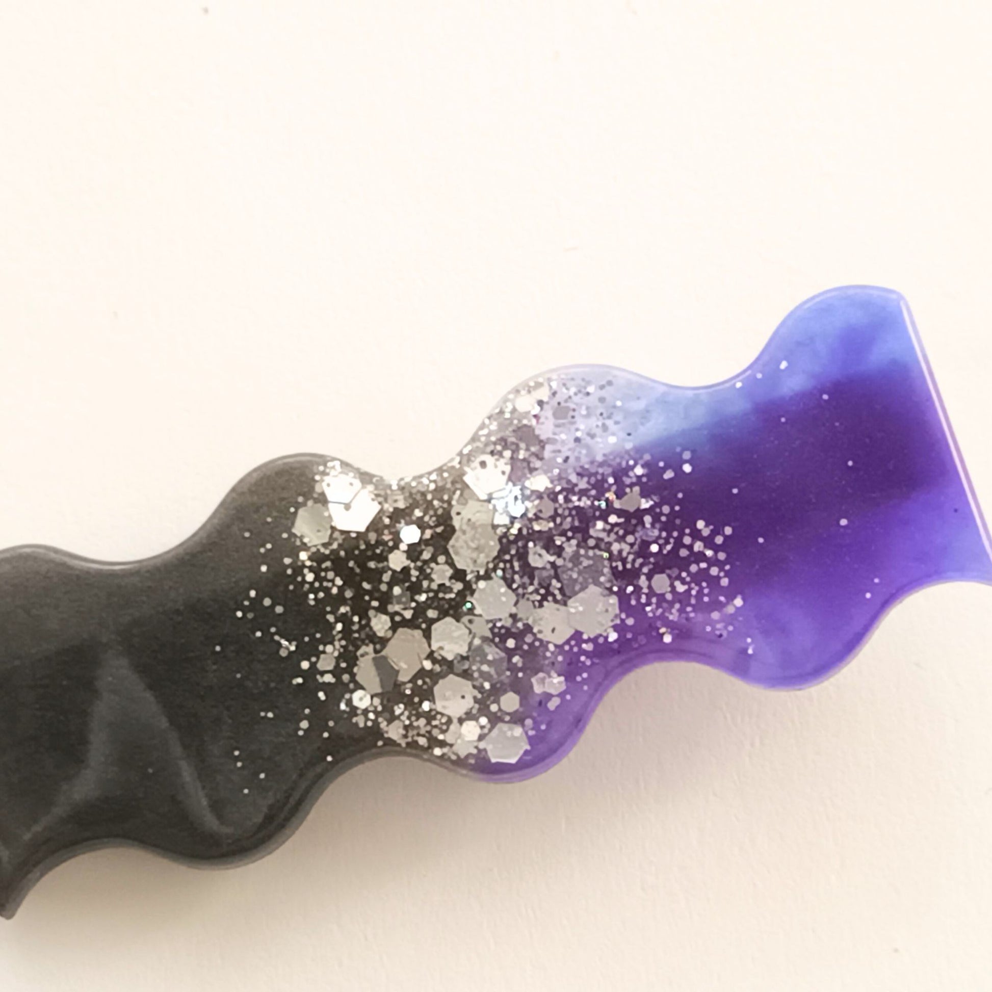 Une galaxie ondulée dans vos cheveux ! Sublimez votre coiffure avec cette barrette en résine forme vagues violet et noir avec paillettes argentées, entièrement faite main dans mon atelier.