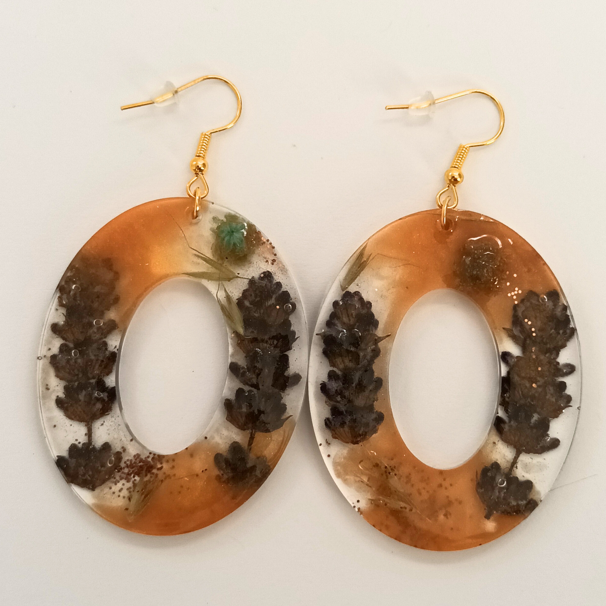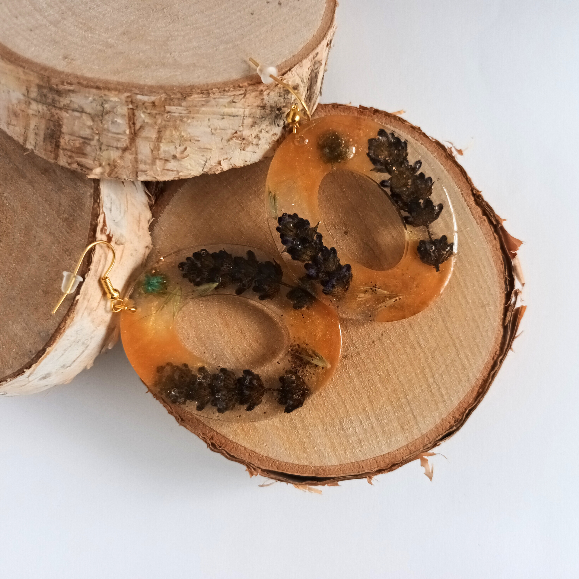 Boucles d'oreilles résine orange fleurs séchées lavande - Ovales botaniques ultra-légères - Bijou artisanal unique fait main