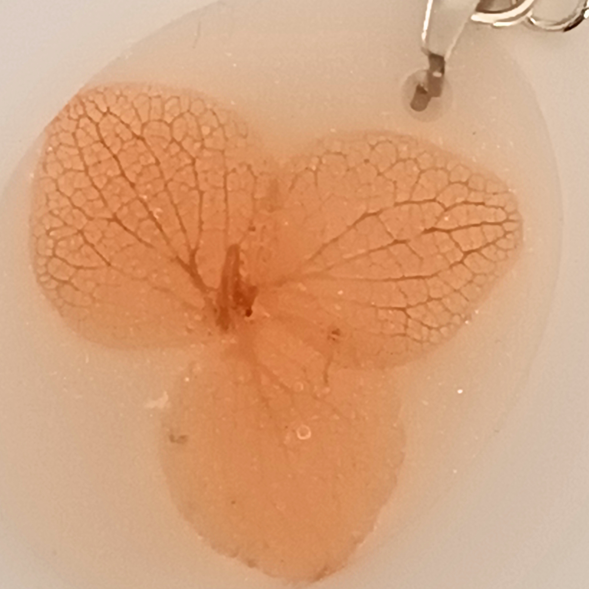Teinte : transparent cristallin avec fleurs d'hortensia séchées aux délicates teintes pêche et abricot, créant un effet herbier naturel romantique et intemporel