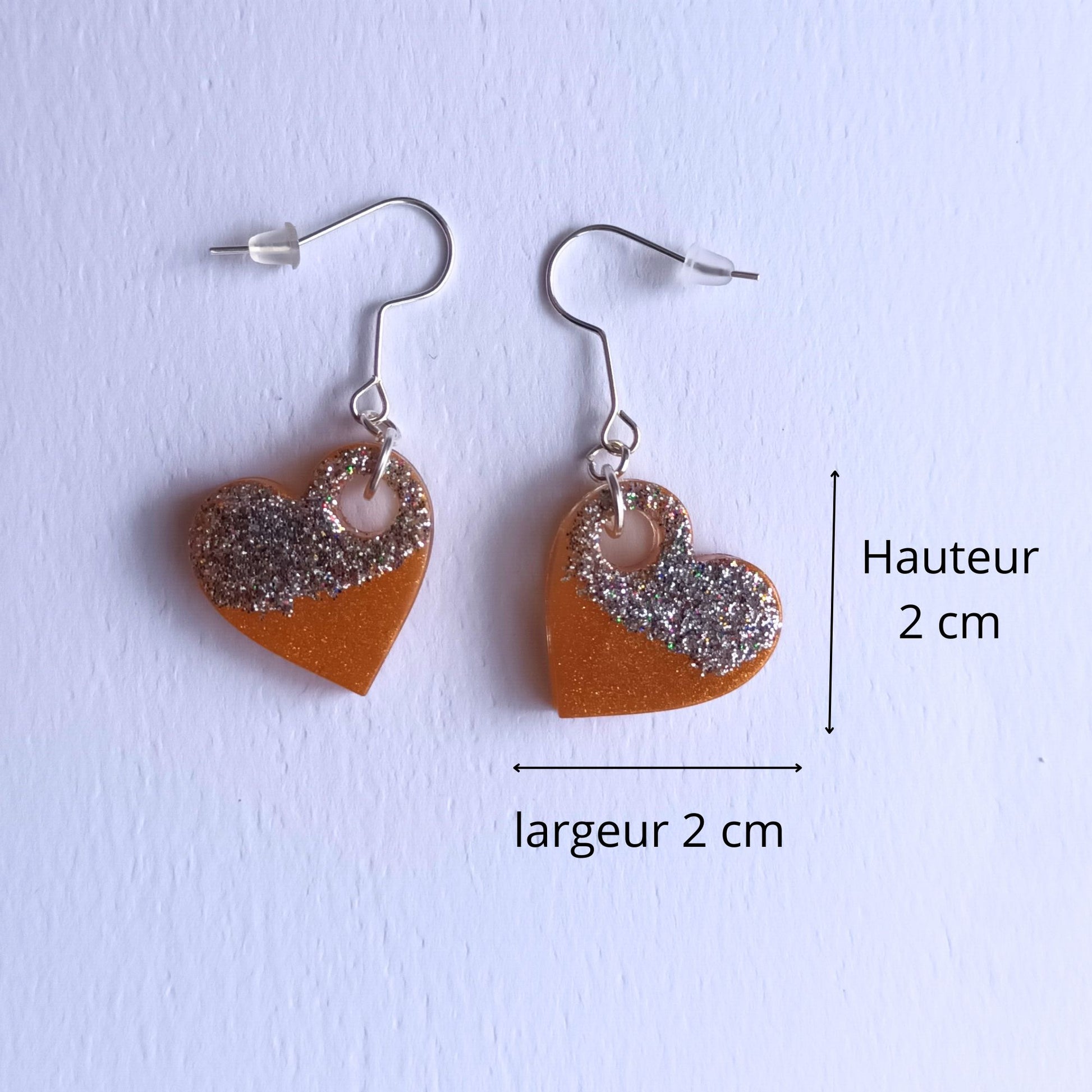 Boucles d'Oreilles Pendants Cœur Orange et Paillettes Argentées