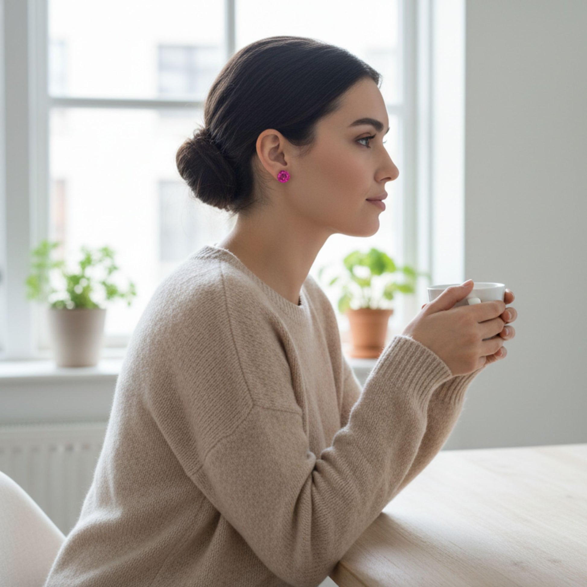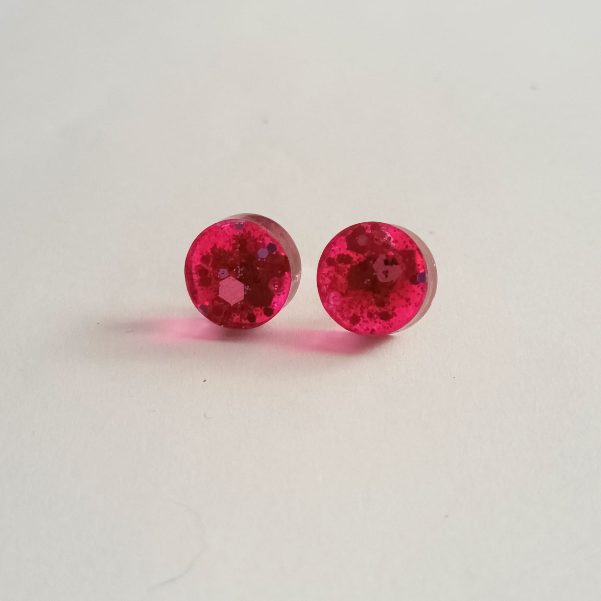 Apportez une touche de couleur pop à votre quotidien avec ces Boucles d'Oreilles Puces Rondes en résine aux reflets Fuchsia Scintillant, entièrement faites main dans mon atelier.