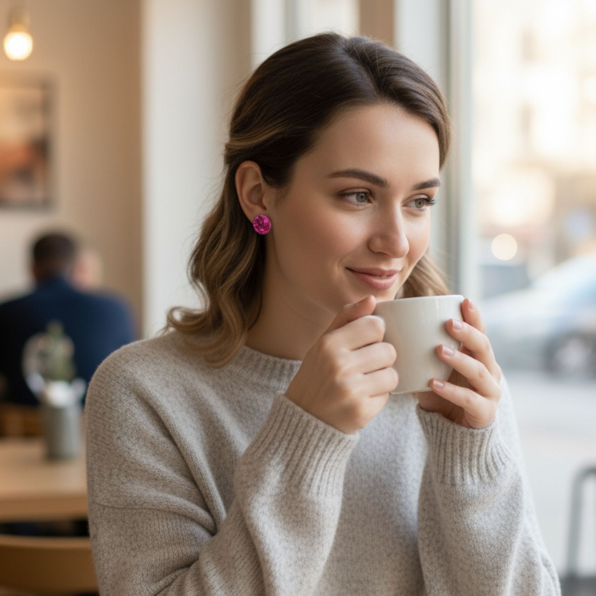 Boucles d'Oreilles Puces Rondes Rose Fushia Pailleté - Bijou Résine