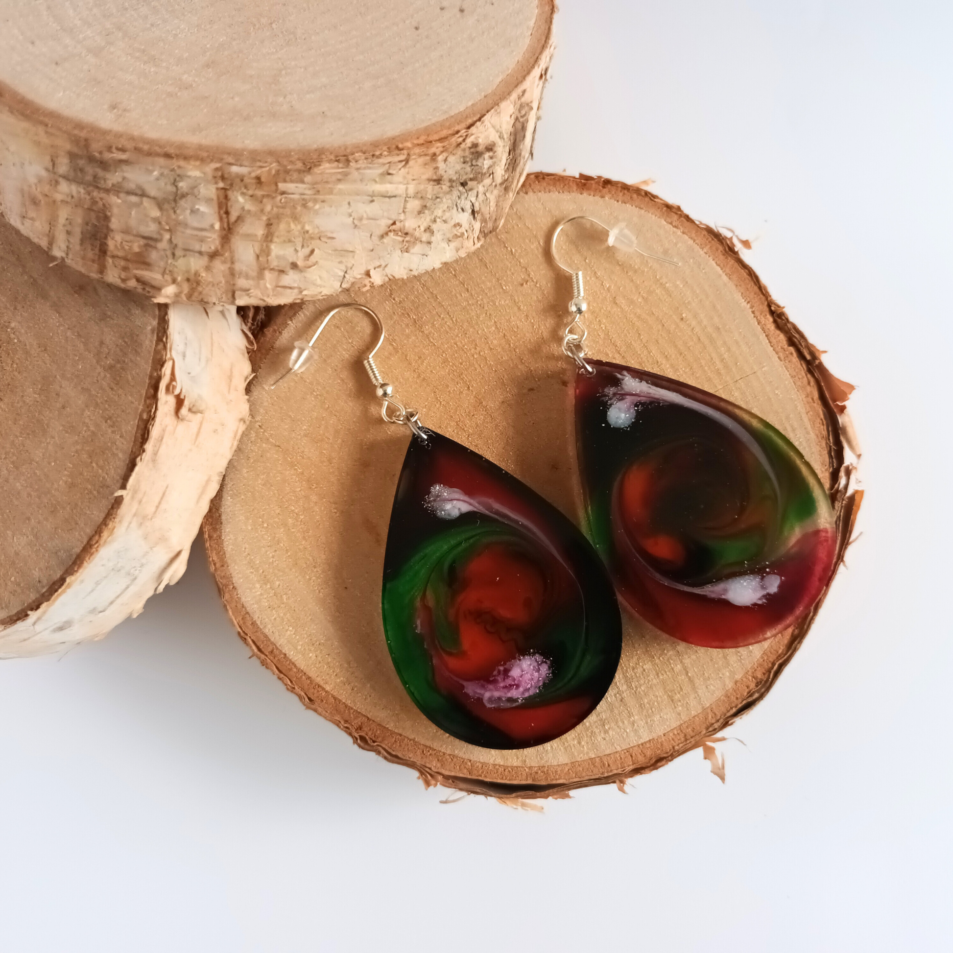 Boucles d'oreilles résine gouttes vert rouge blanc - Tourbillons multicolores ultra-légères - Bijou artisanal unique fait main
