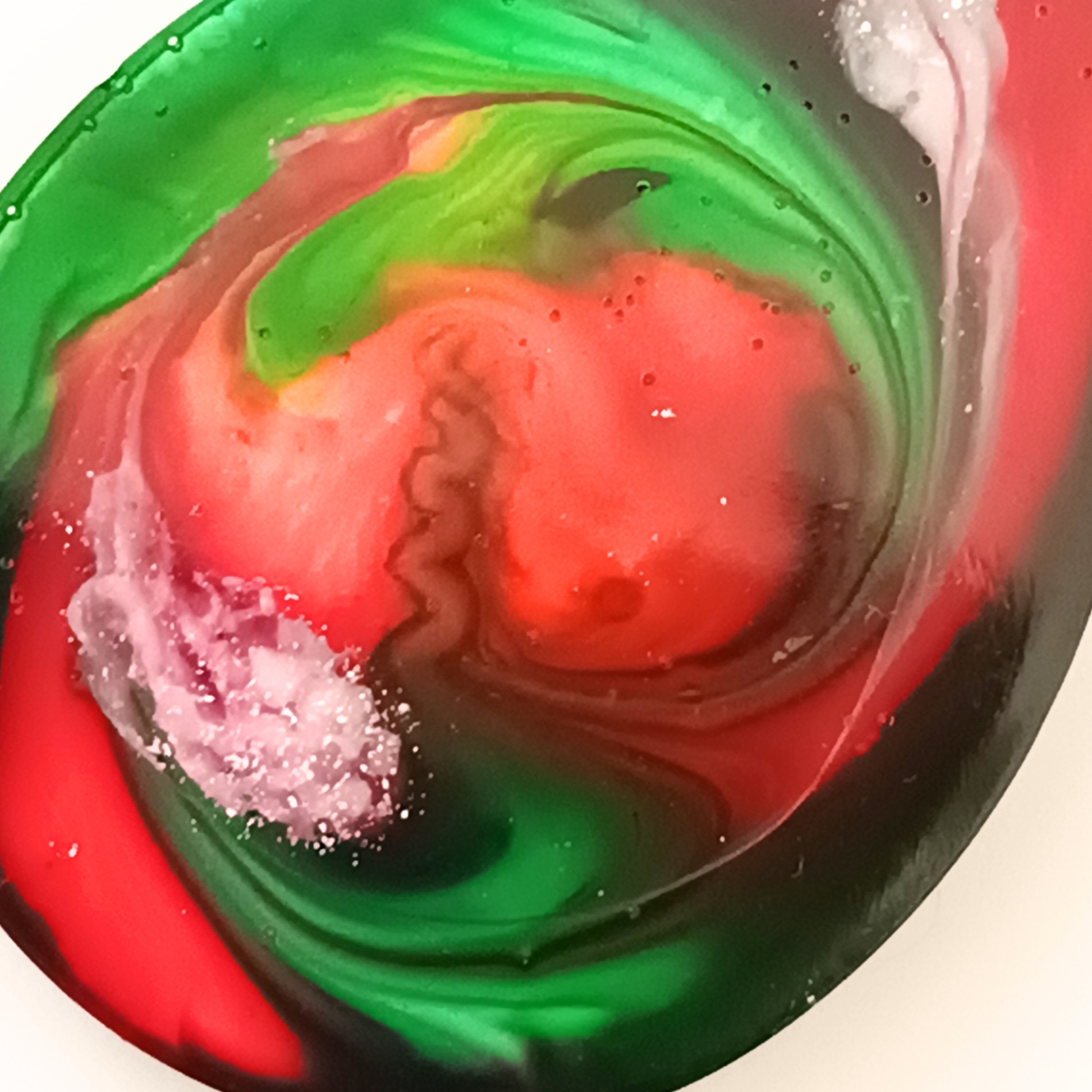 Teinte : tourbillons hypnotiques de vert émeraude intense et rouge vif mêlés de blanc laiteux et transparent, créant un effet abstrait artistique captivant