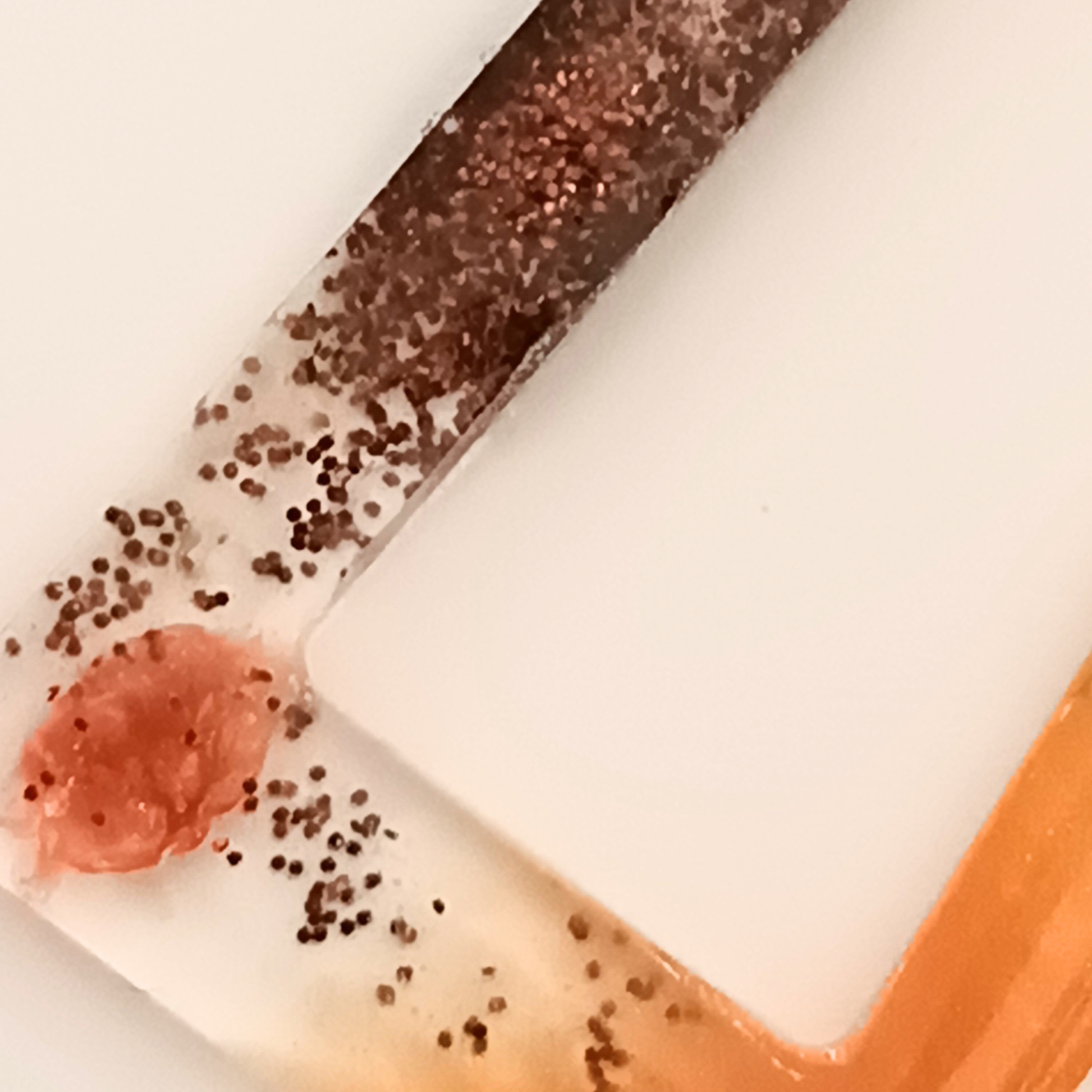 Teinte : orange doux abricot marbré de transparent avec fleurs séchées naturelles et paillettes cuivrées dorées, créant un effet herbier automnal chaleureux et lumineux