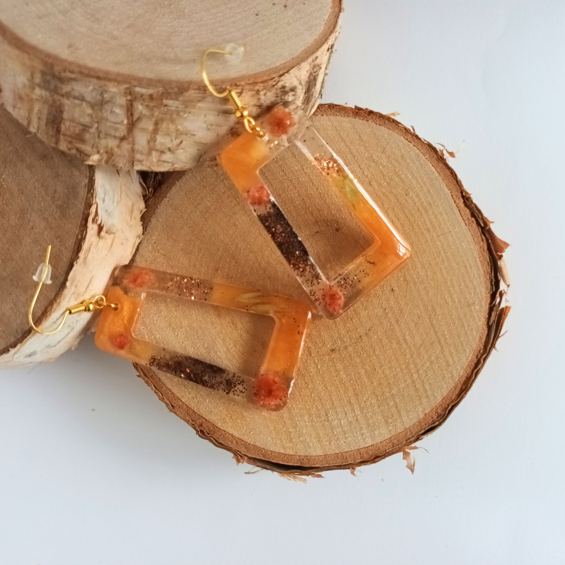 Boucles d'oreilles résine orange fleurs séchées pailleté - Rectangles botaniques ultra-légers - Bijou artisanal unique fait main