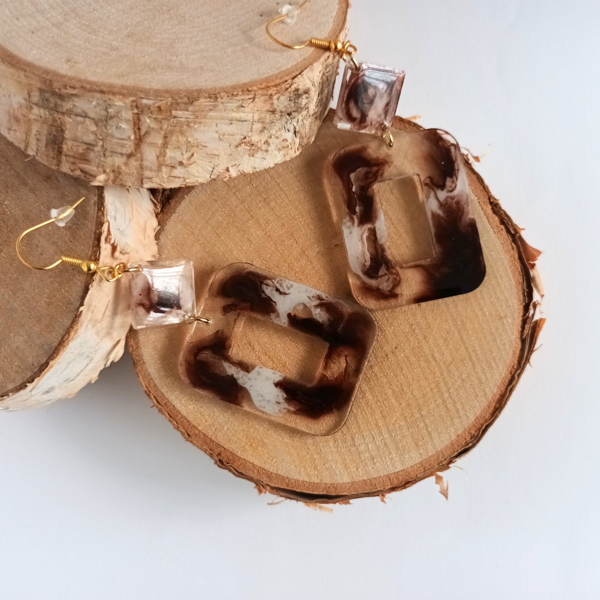 L'élégance du marbre en bijou ! Sublimez votre style avec ces boucles d'oreilles en résine aux reflets marron, blanc et transparent, entièrement faites main dans mon atelier.
