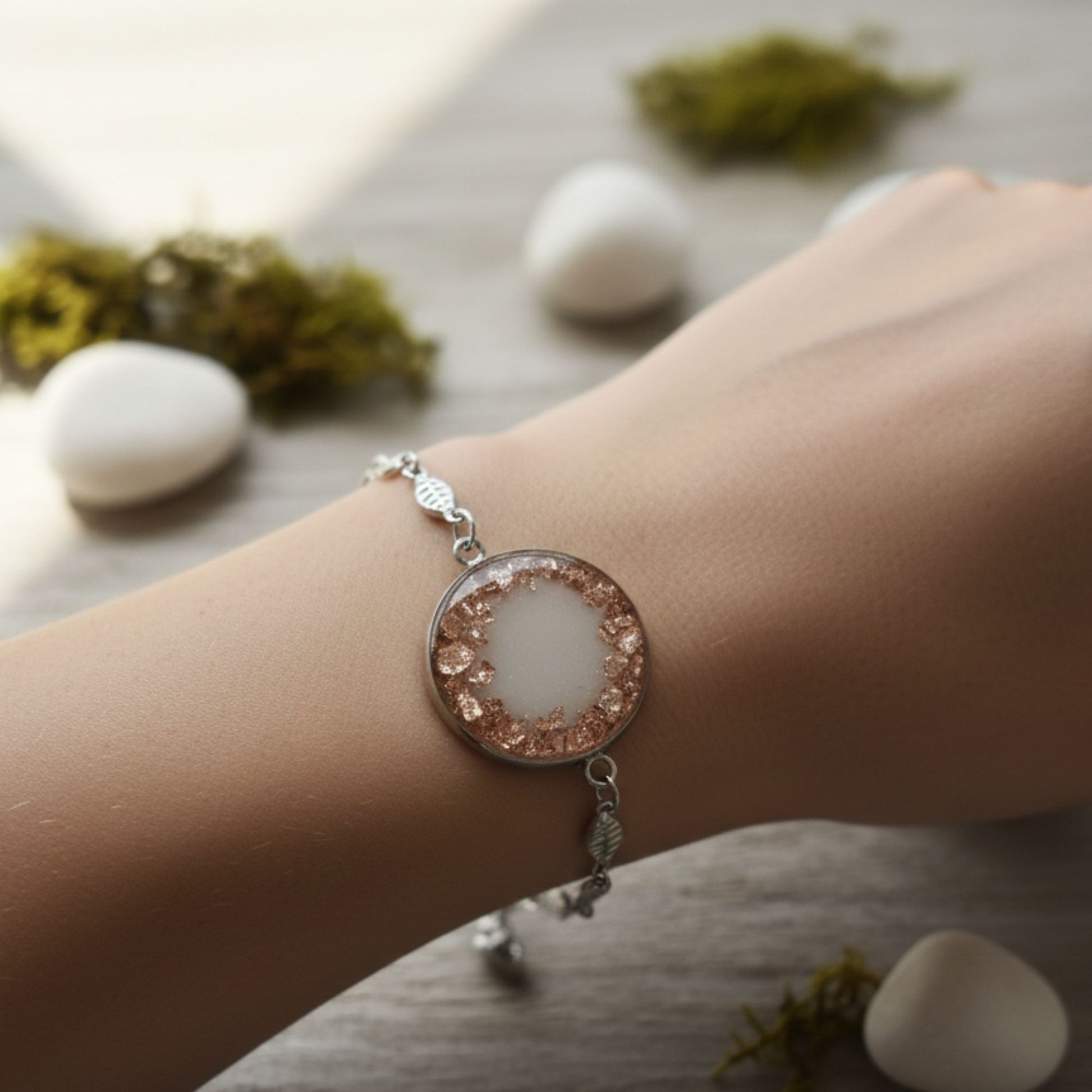 Chaque bracelet est créé avec amour et passion dans mon atelier en France. Je coule la résine et positionne les cristaux de verre à la main, ce qui fait de chaque bijou une œuvre d'art unique. Les légères variations de motif et d'éclat sont la preuve de cette fabrication 100% artisanale.