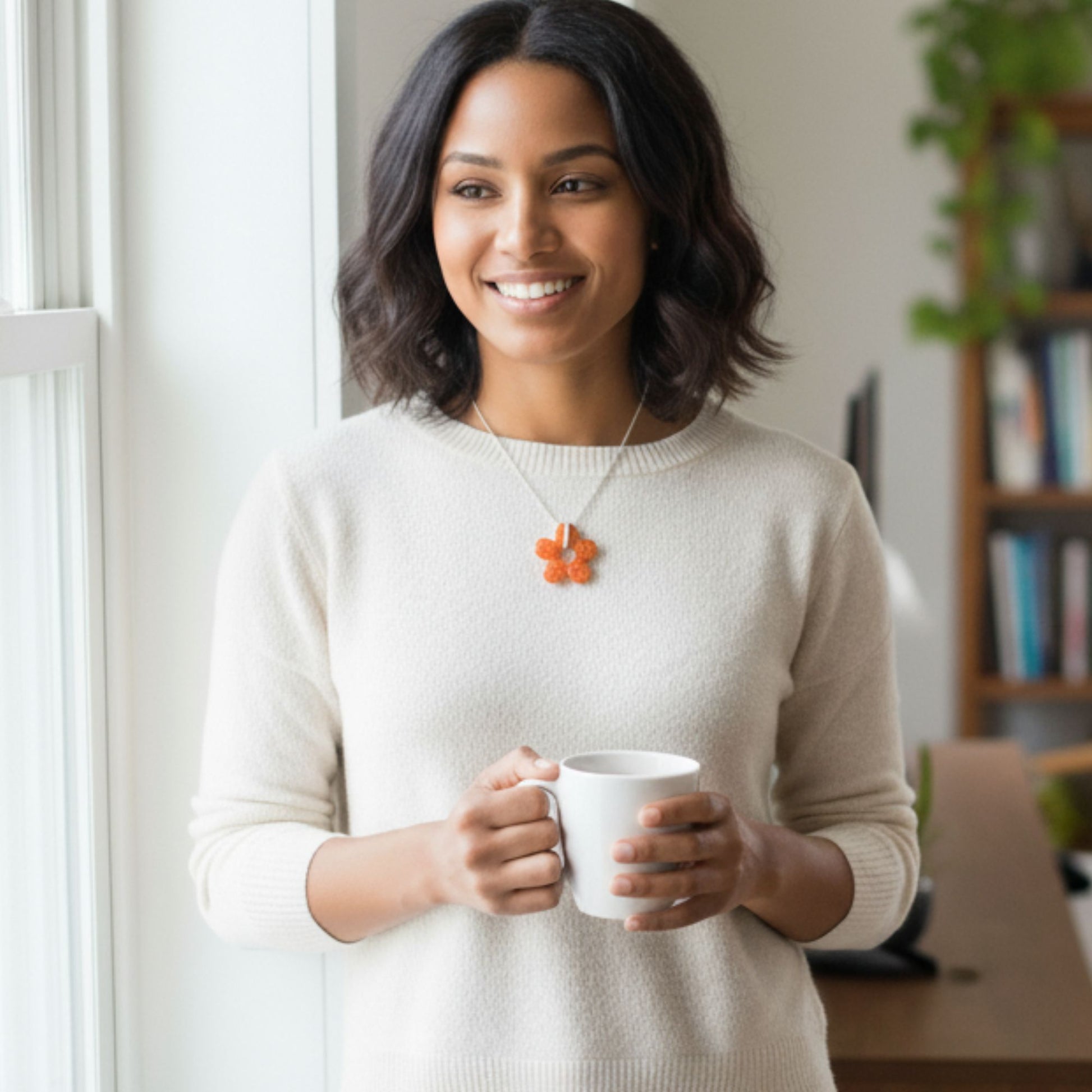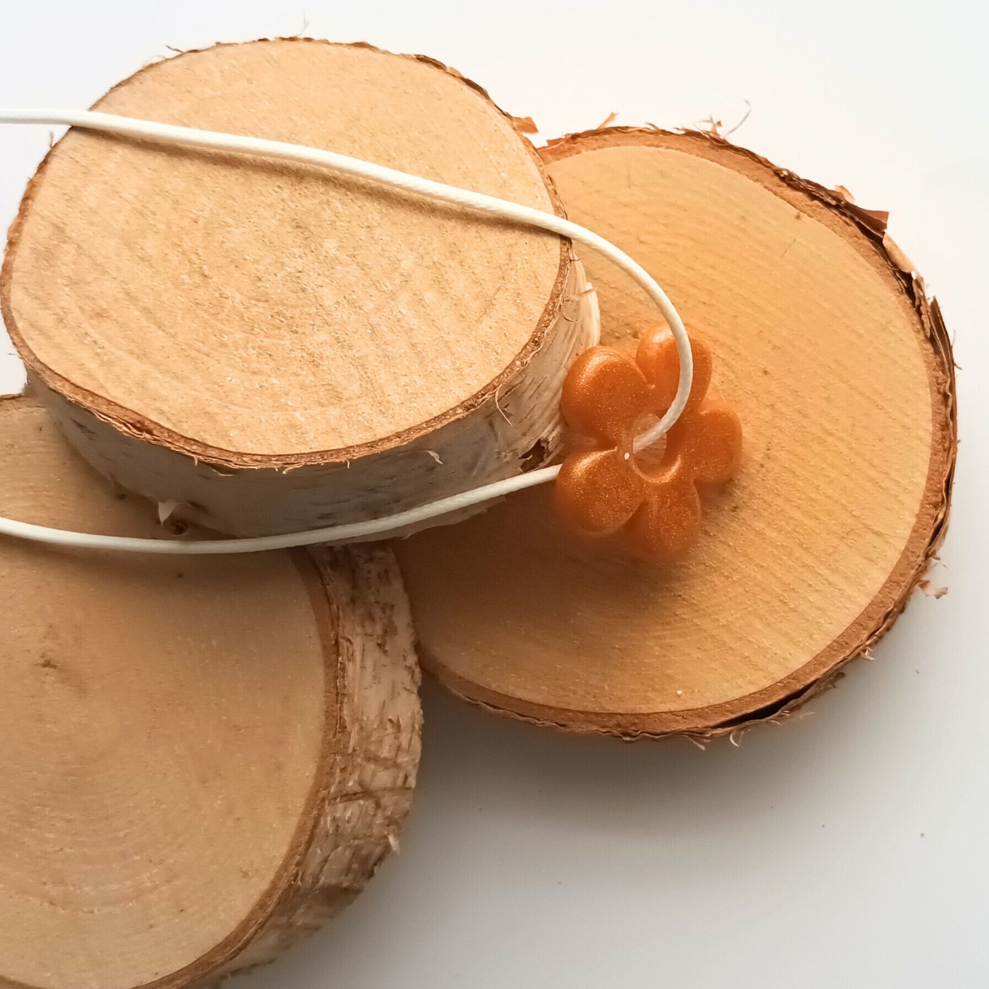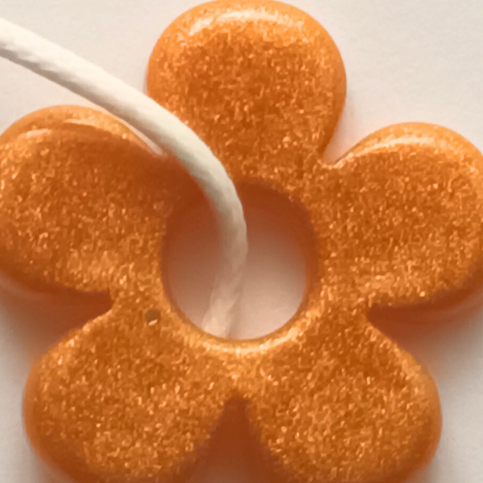 Une fleur de soleil à porter ! Sublimez votre style avec ce collier pendentif en résine en forme de fleur aux quatre pétales orange pailleté sur cordon blanc, entièrement fait main dans mon atelier.