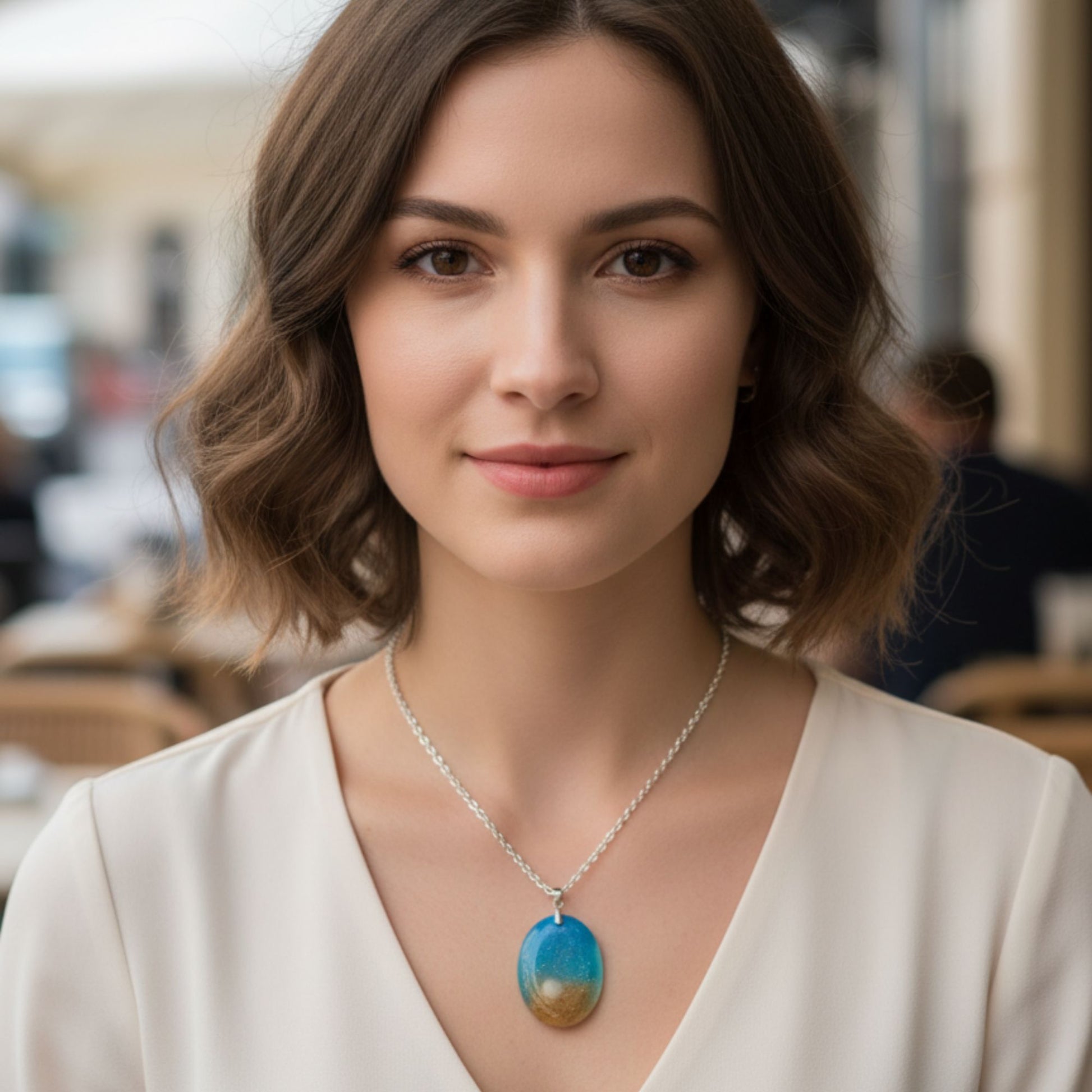 Emportez la plage avec vous ! Sublimez votre style avec ce collier pendentif en résine aux reflets bleu océan avec inclusion de sable et coquillage, entièrement fait main dans mon atelier.