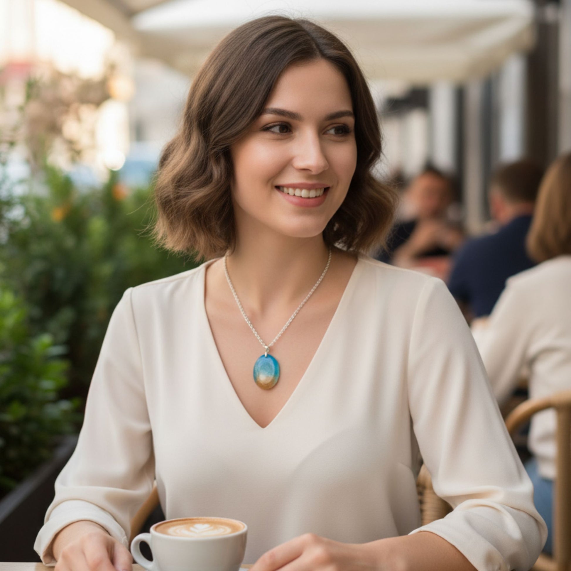 Chaque collier est créé avec amour dans mon atelier en France. Je coule la résine à la main, ajoute les paillettes une à une, dispose le sable délicatement et façonne chaque élément avec soin. Cette création est unique : je ne réalise jamais deux fois le même modèle. Vous serez la seule à posséder ce bijou exclusif !