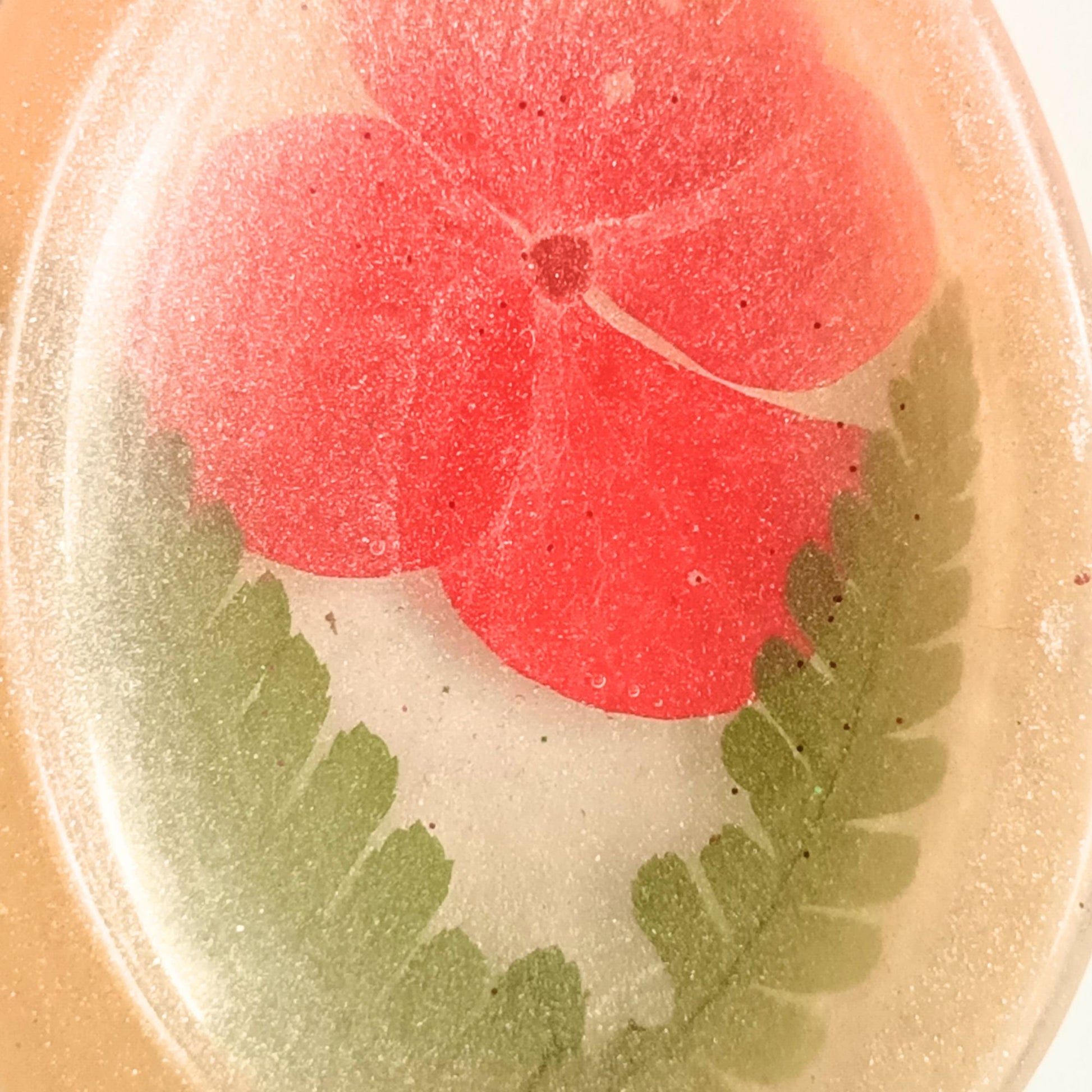 Matériaux : Résine époxy, Fleur séchée (nuances rouge), Feuille de fougère séchée, Mica Ambre/Doré.