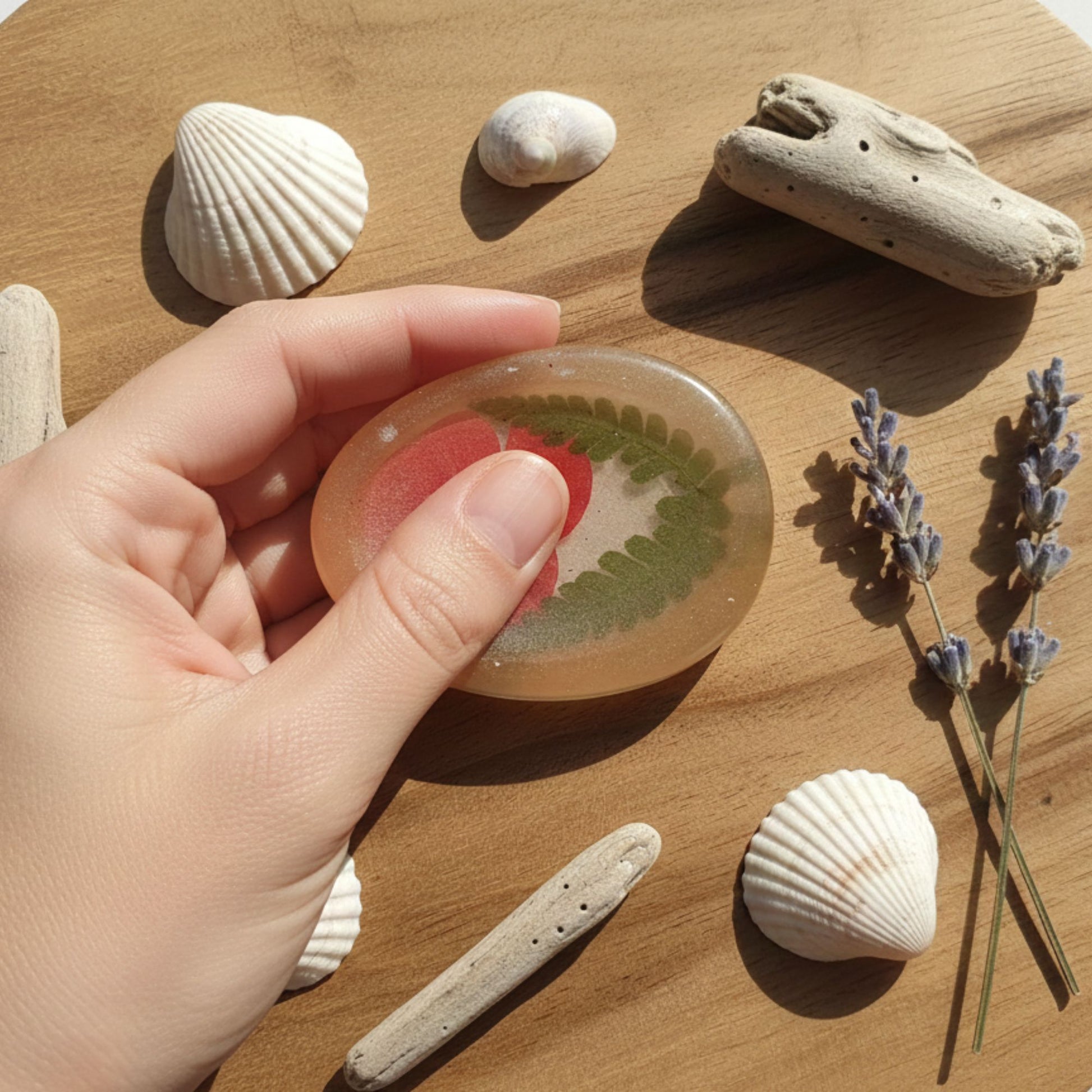 FABRICATION ARTISANALE FRANÇAISE Chaque pièce est une création unique. Je réalise chaque étape à la main dans mon atelier : de la préparation de la résine et des pigments, à l'inclusion méticuleuse des éléments (fleurs, sable, etc.), jusqu'à la finition polie. Cette attention aux détails garantit que votre galet de sérénité est absolument unique.