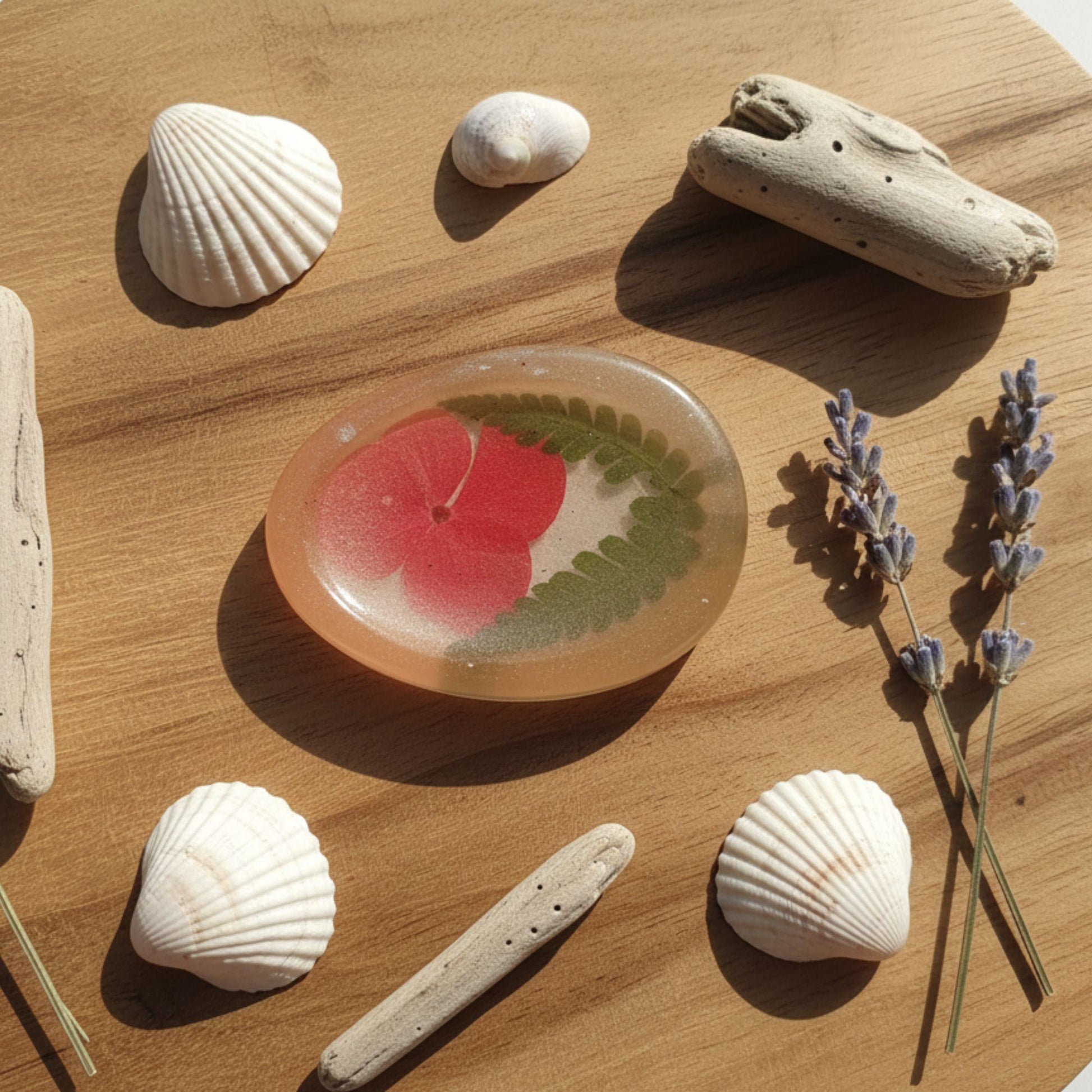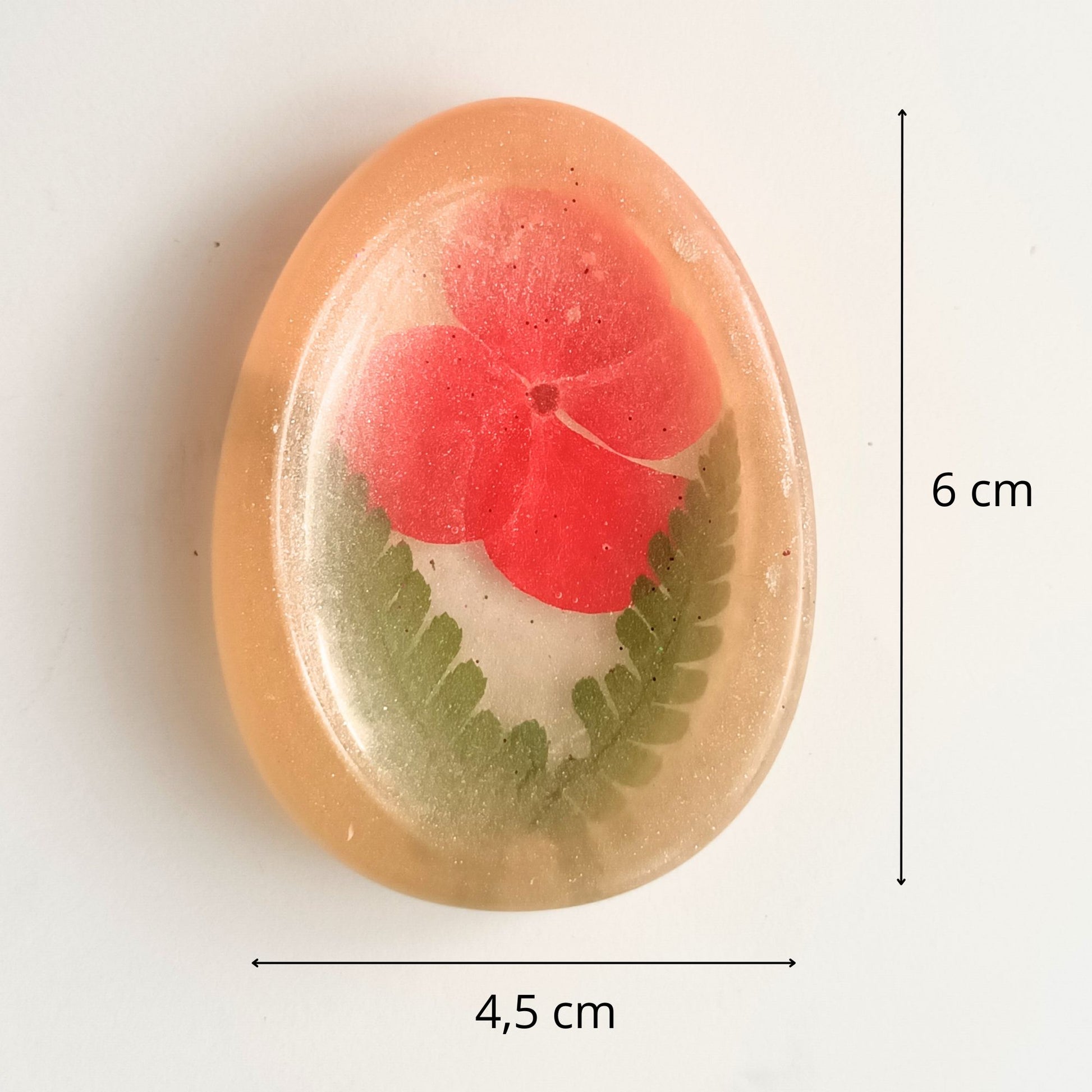 Ce galet met en vedette une magnifique fleur séchée aux nuances de rouge cerise, accompagnée d'une feuille de fougère. La résine transparente est délicatement teintée d'un Mica couleur miel doré sur le pourtour, créant un effet vintage et chaleureux. Un objet d'apaisement qui combine l'utilité du galet anti-stress avec la beauté intemporelle de la nature.