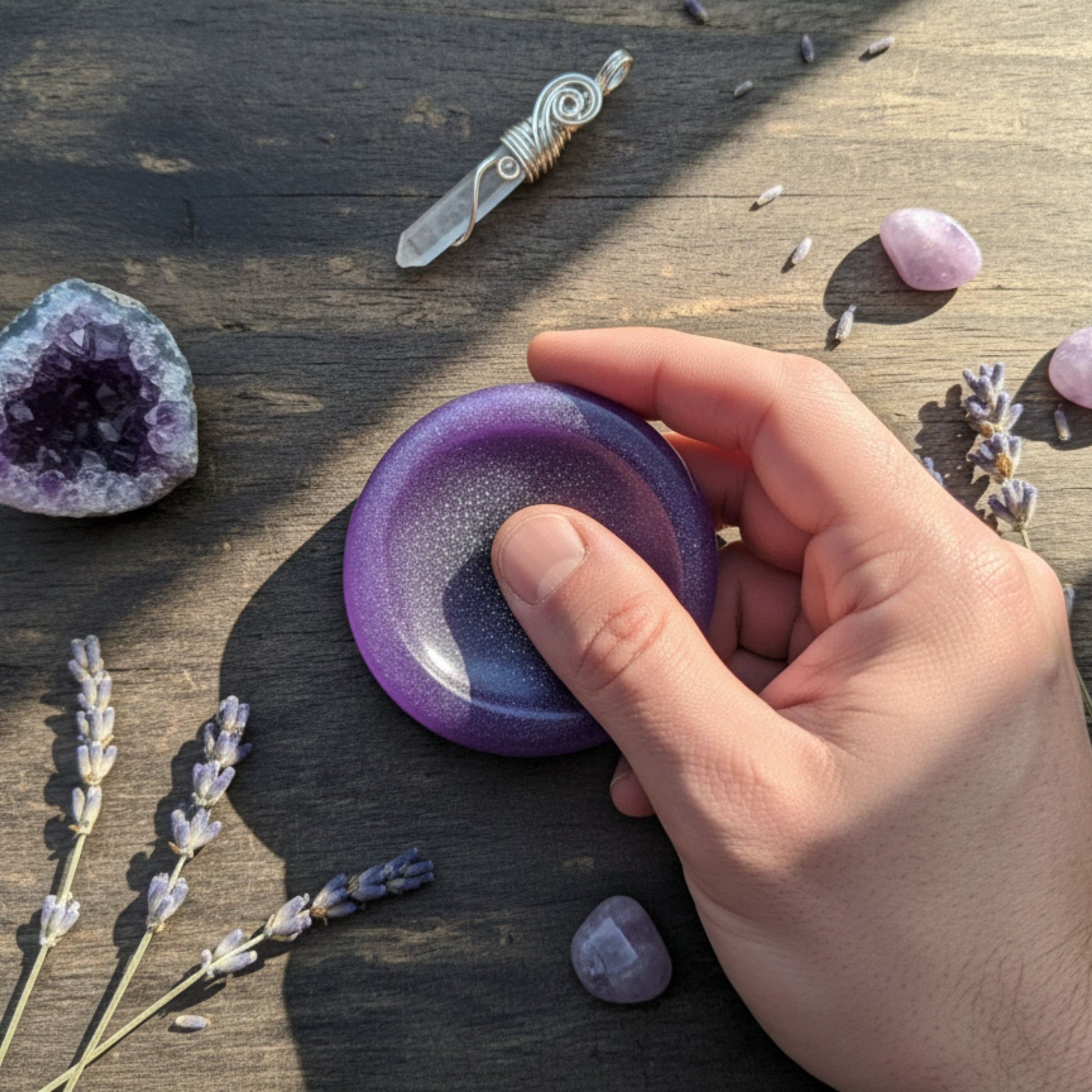 Ce galet de sérénité en résine est une œuvre d'art sensorielle, conçue pour apaiser l'esprit. Sa teinte violette profonde, rappelant l'améthyste, est infusée d'une myriade de paillettes argentées qui créent un effet de nébuleuse scintillante au centre. Sa forme douce et son creux central sont parfaits pour un massage du pouce méditatif, offrant une ancre de calme dans votre main. Créé avec passion dans mon atelier, il est le compagnon idéal pour vos moments de détente.