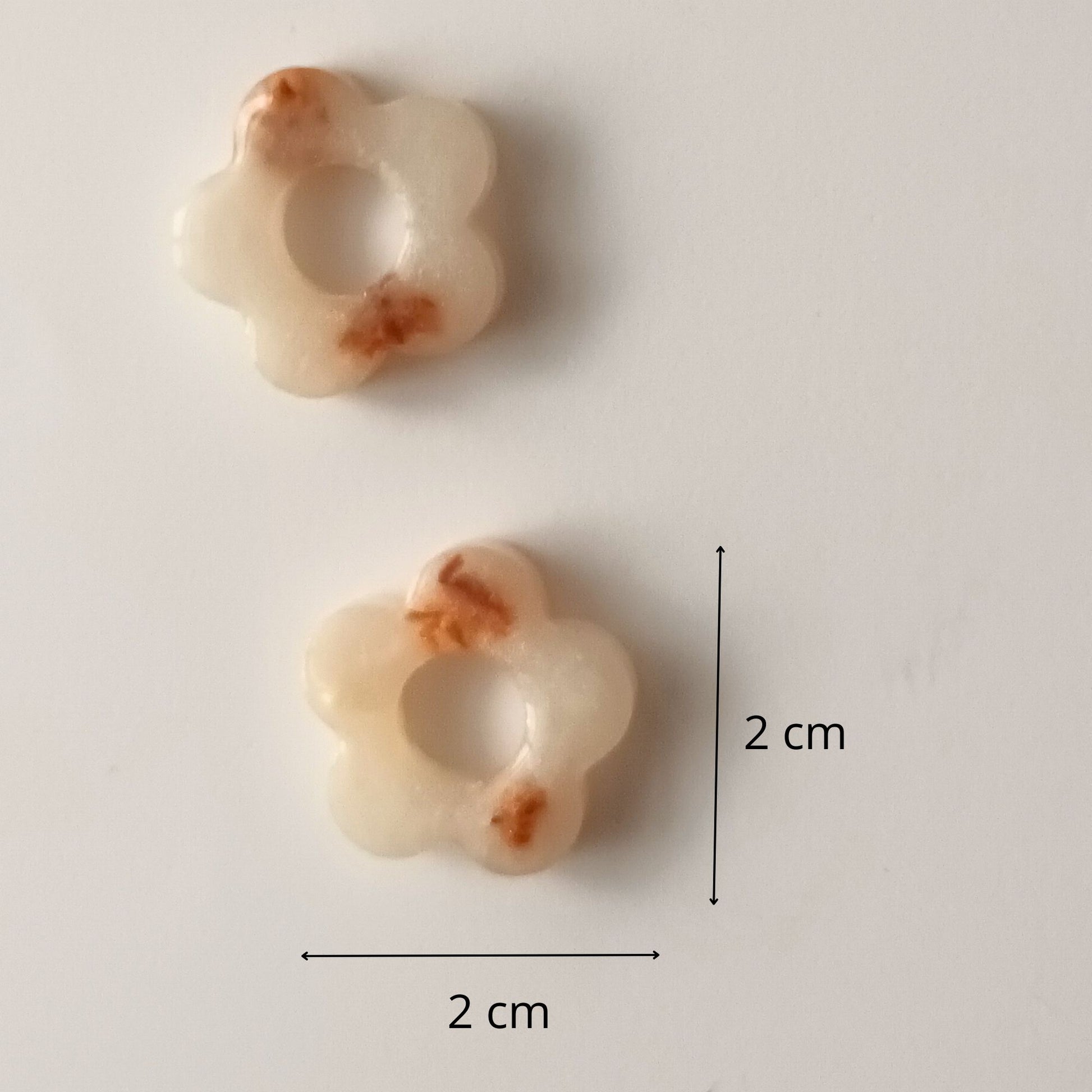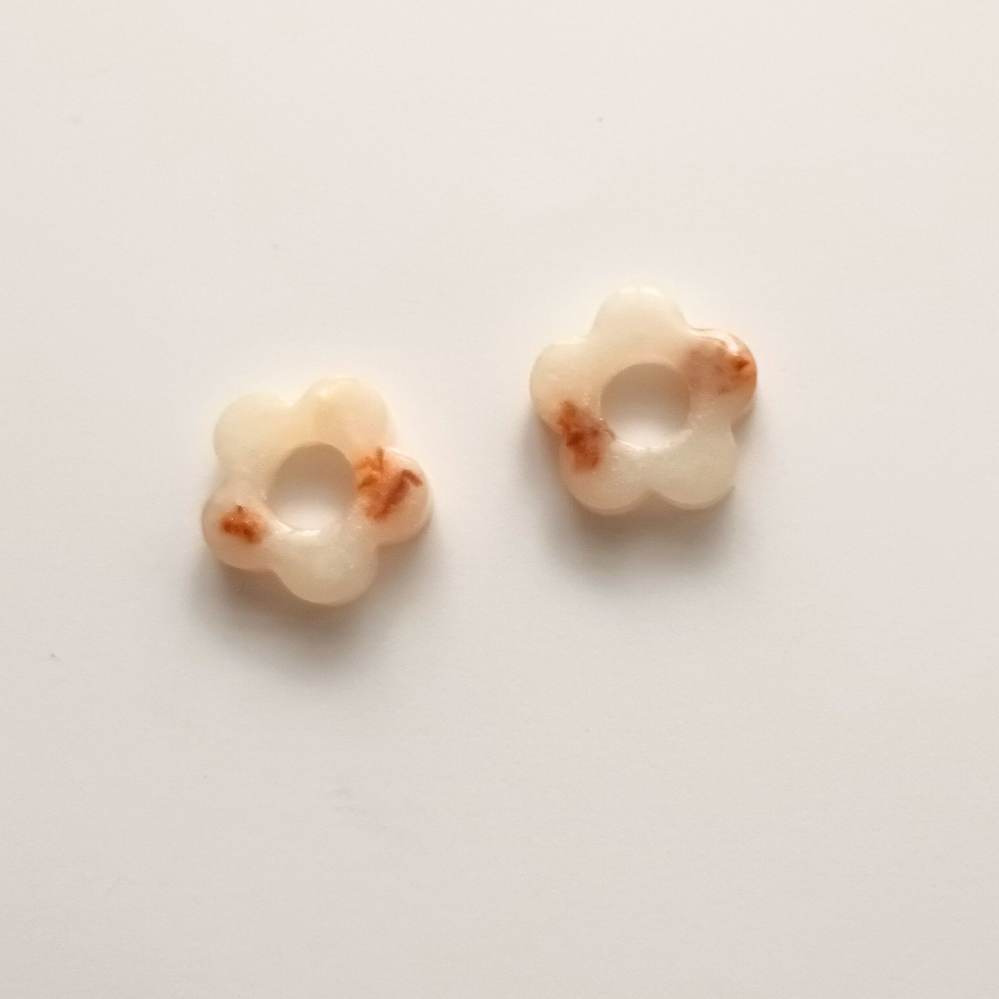 Des fleurs nacrées pour vos créations ! Sublimez vos bijoux DIY avec ce lot de 2 breloques en résine en forme de fleurs blanc nacré avec touches dorées, inclusions de fleurs séchées, entièrement faites main dans mon atelier.