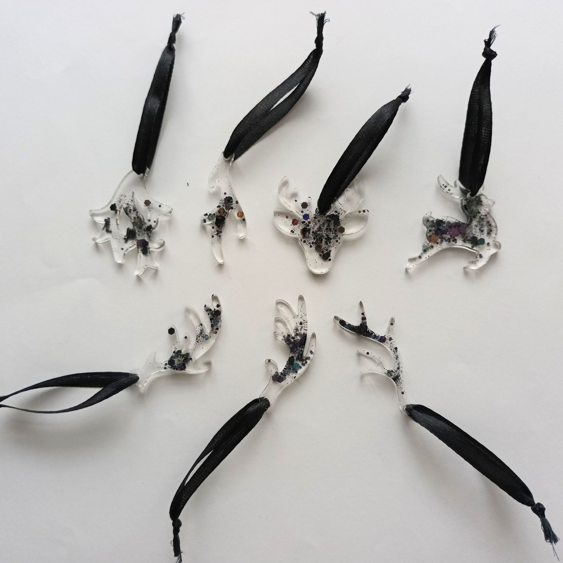 Apportez une touche de fantaisie à votre décoration avec ce Lot de 7 Suspensions Têtes de Renne et Bois en résine aux reflets Cosmos, entièrement faites main dans mon atelier.