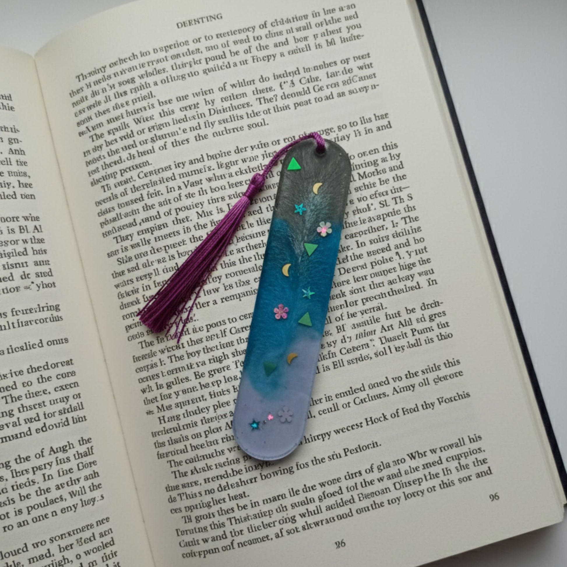 Le crépuscule magique entre vos pages ! Sublimez vos lectures avec ce marque-page en résine avec dégradé gris, bleu et violet parsemé d'étoiles, lunes et motifs cosmiques avec pompon violet, entièrement fait main dans mon atelier.