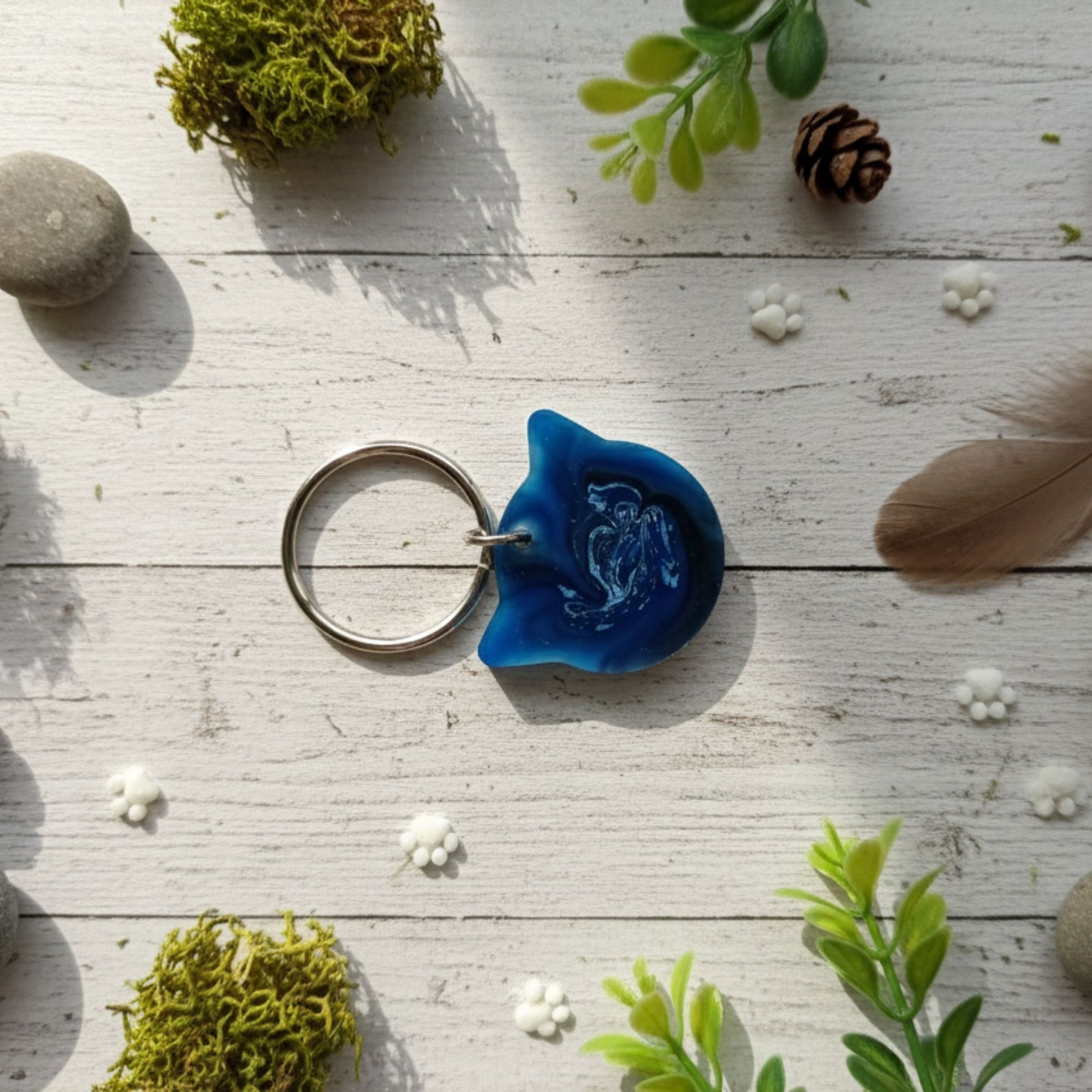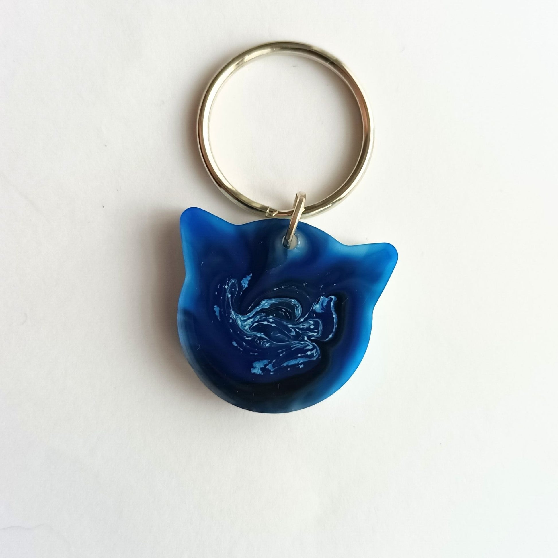Médaillon d'Identification Tête de Chat - Résine Bleu et Blanc Marbré