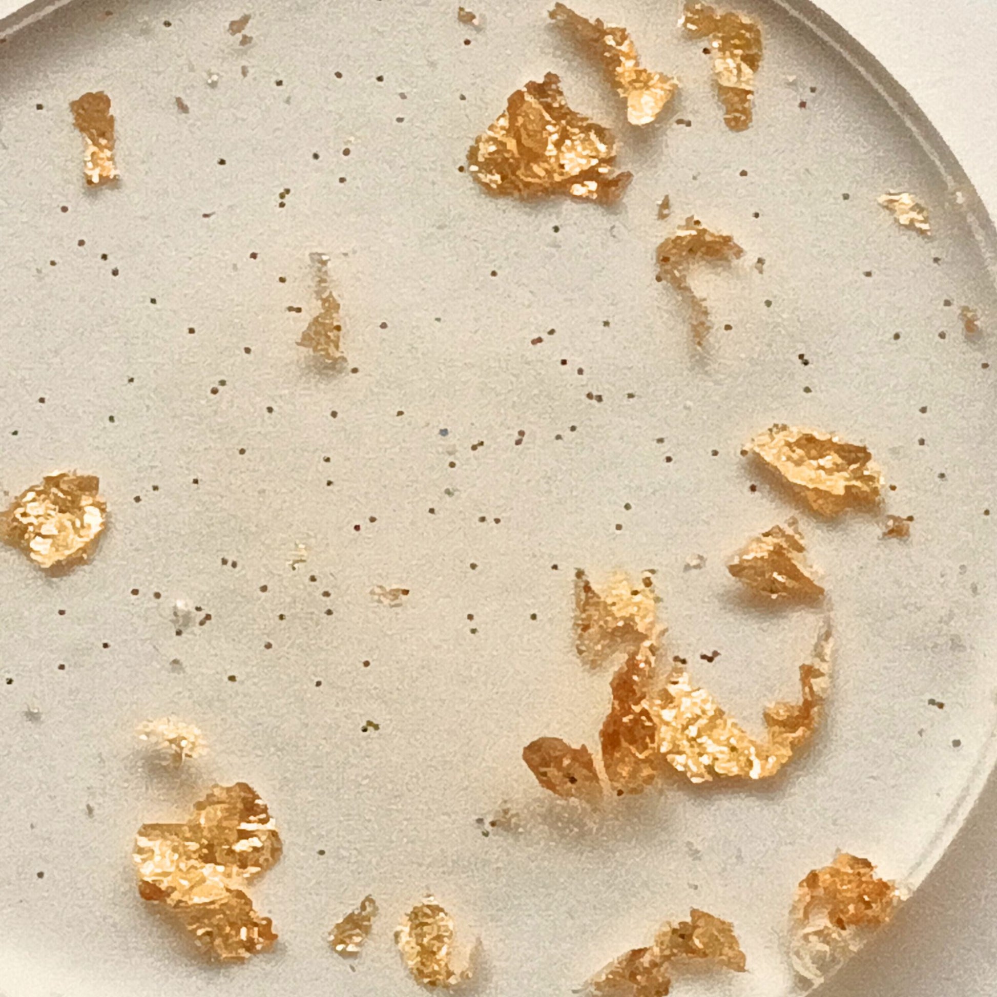 Teinte : blanc transparent laiteux parsemé de feuilles dorées et paillettes délicates, créant un effet minimaliste luxueux élégant et intemporel