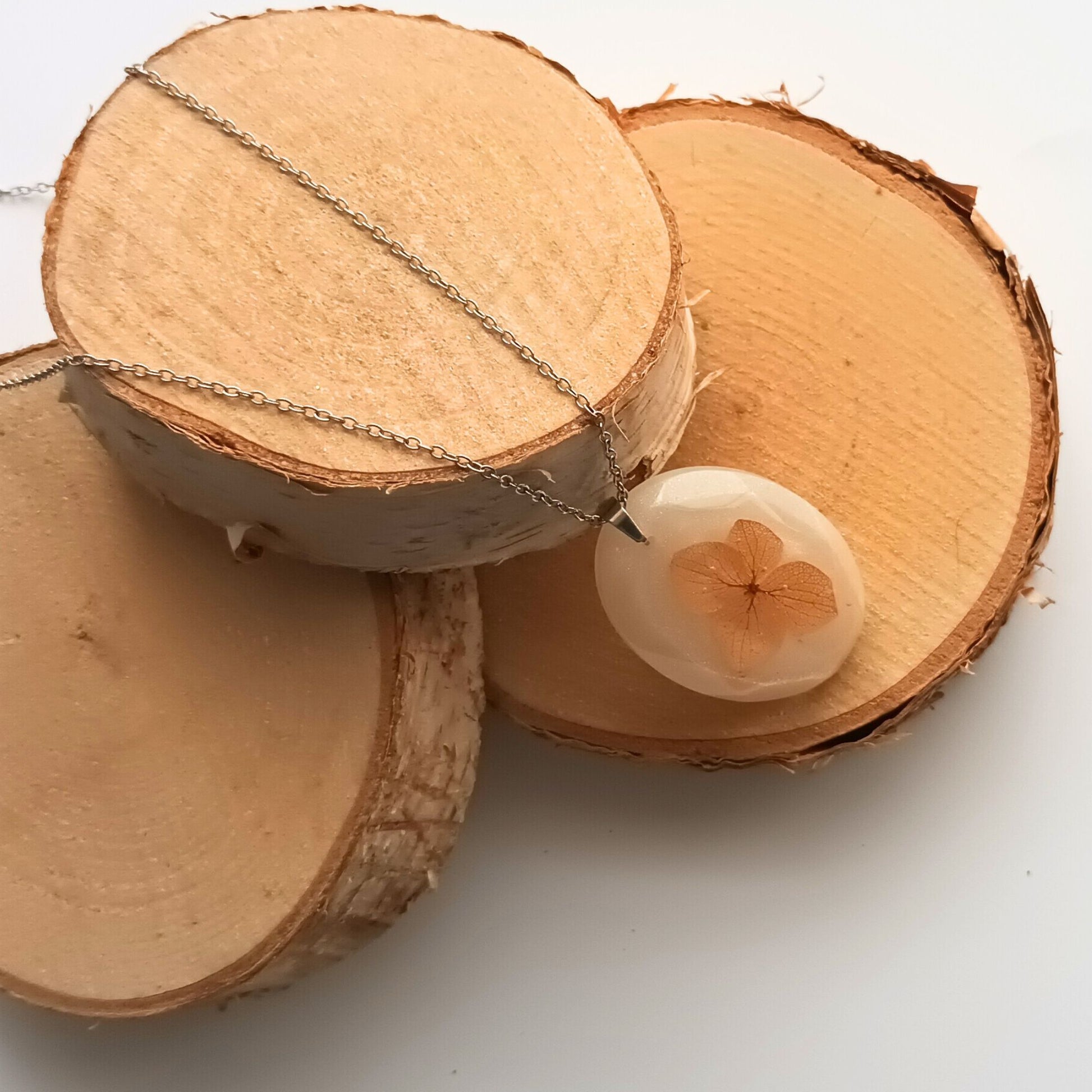Portez la délicatesse florale au quotidien ! Sublimez votre style avec ce collier pendentif en résine nacrée avec véritable fleur séchée, entièrement fait main dans mon atelier.