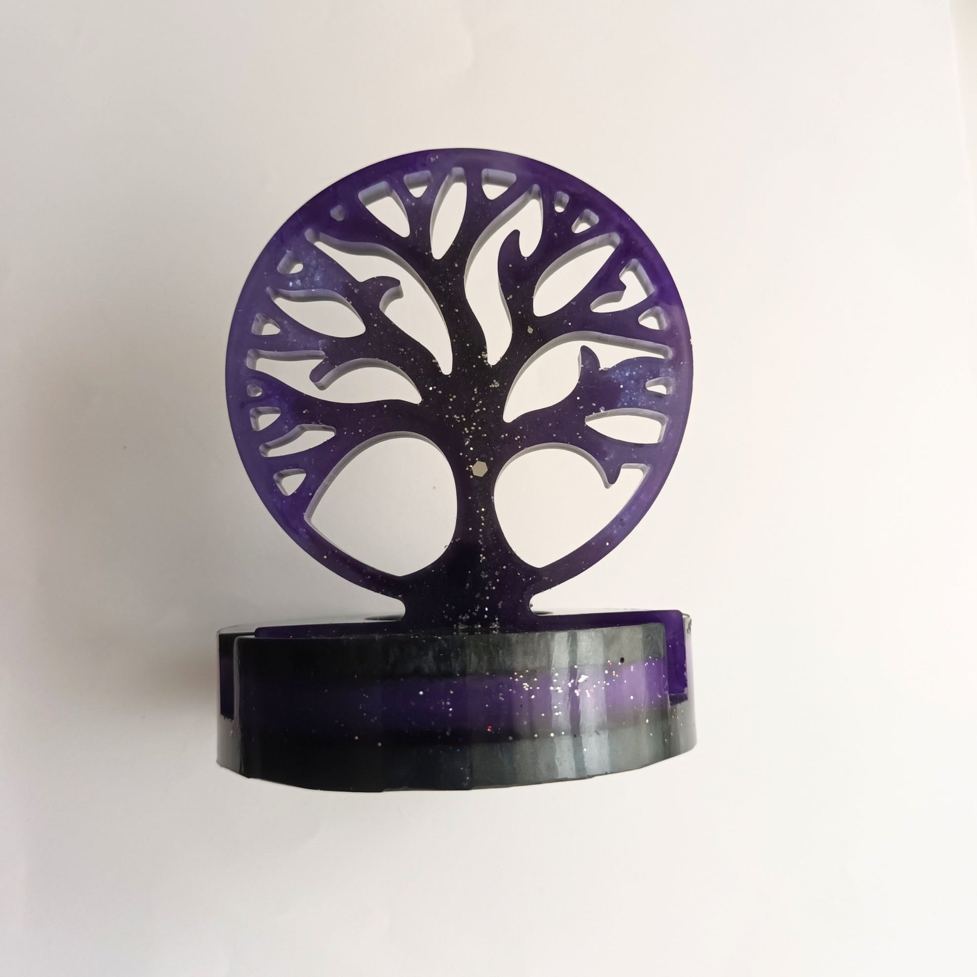 Découvrez la magie d'un photophore unique, façonné artisanalement dans mon atelier. Cet Arbre de Vie en résine captive avec ses teintes de violet profond rehaussées de paillettes galaxie scintillantes. Une création exclusive qui transforme votre espace en véritable sanctuaire lumineux, alliant élégance naturelle et mystère cosmique pour une ambiance envoûtante.