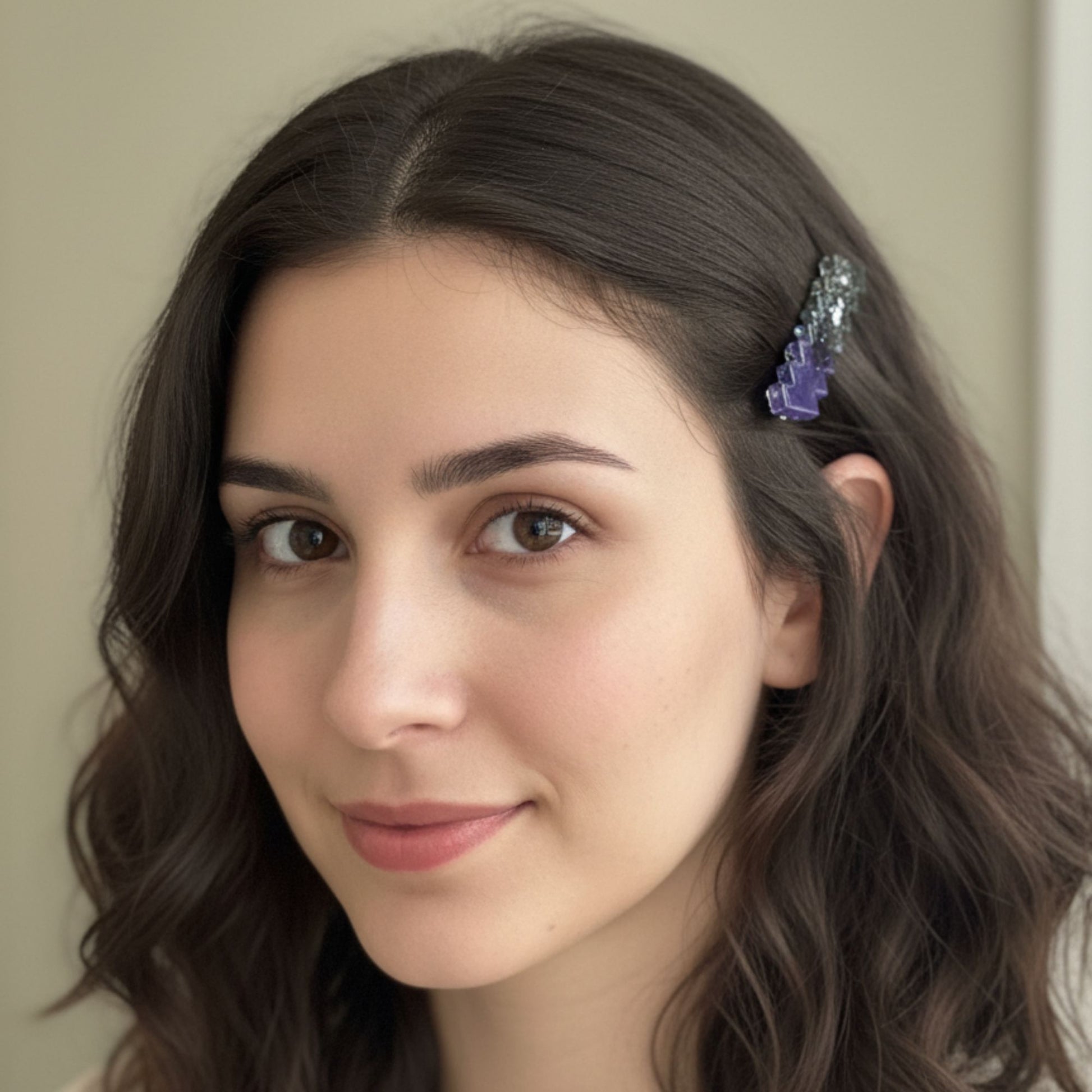 Chaque pince à cheveux est créée avec amour dans mon atelier en France. Je coule la résine à la main, ajoute les paillettes une à une et façonne chaque élément avec soin. Les légères variations font le charme unique de votre bijou - il n'en existe pas deux identiques !