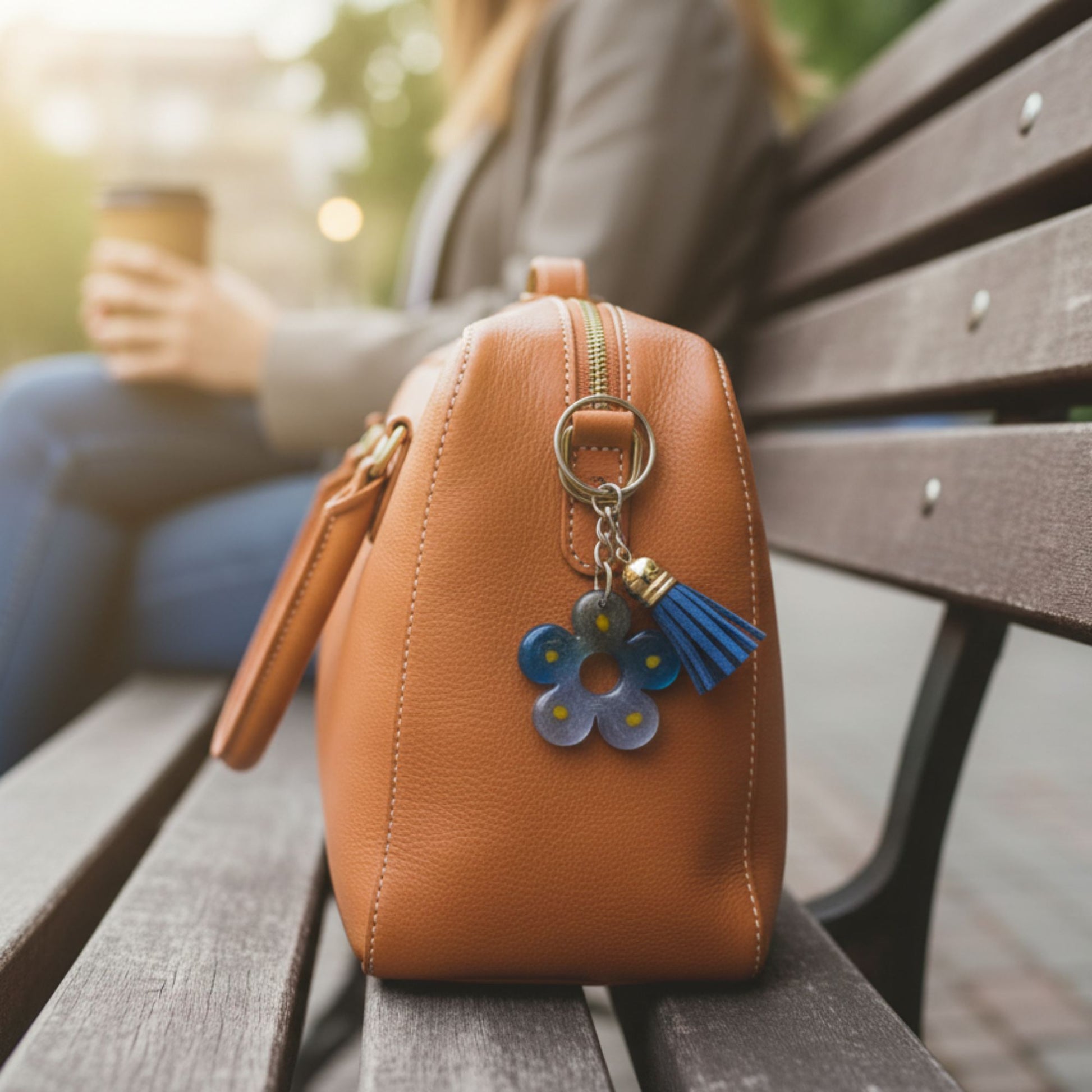 Porte-Clé Fleur Céleste en Résine Bleue et Grise - Pompom Suédine