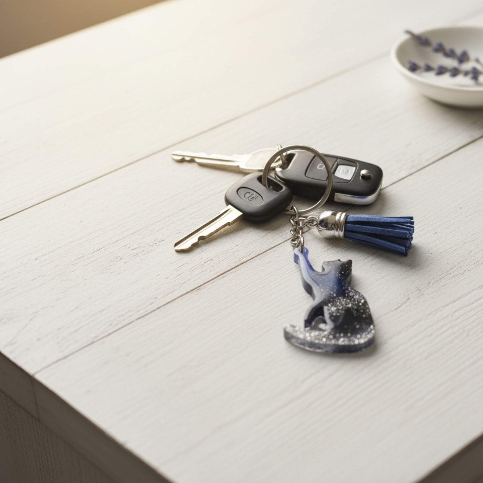 Adoptez l'élégance mystérieuse avec ce porte-clés chat en résine aux reflets noirs pailletés, entièrement fait main dans mon atelier.