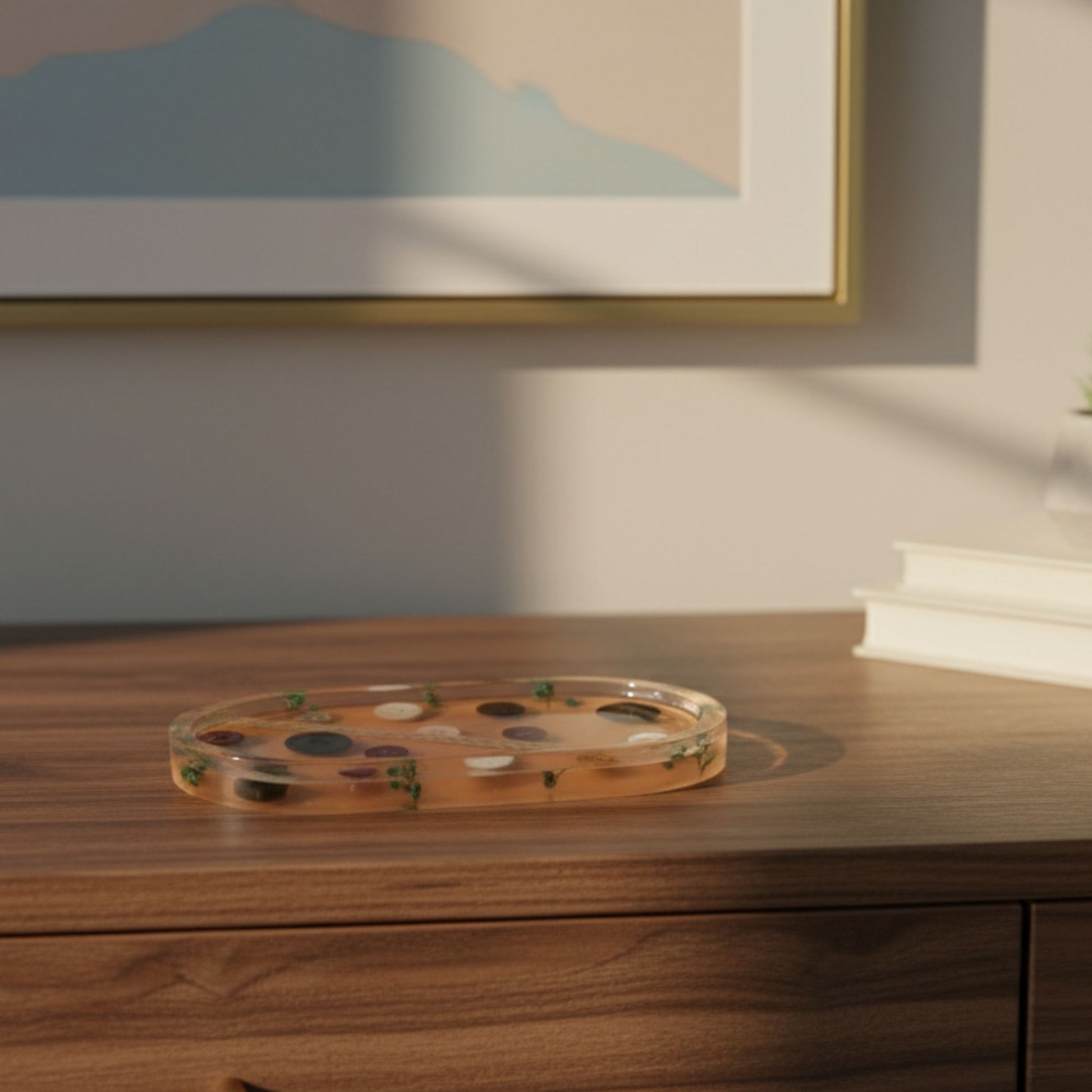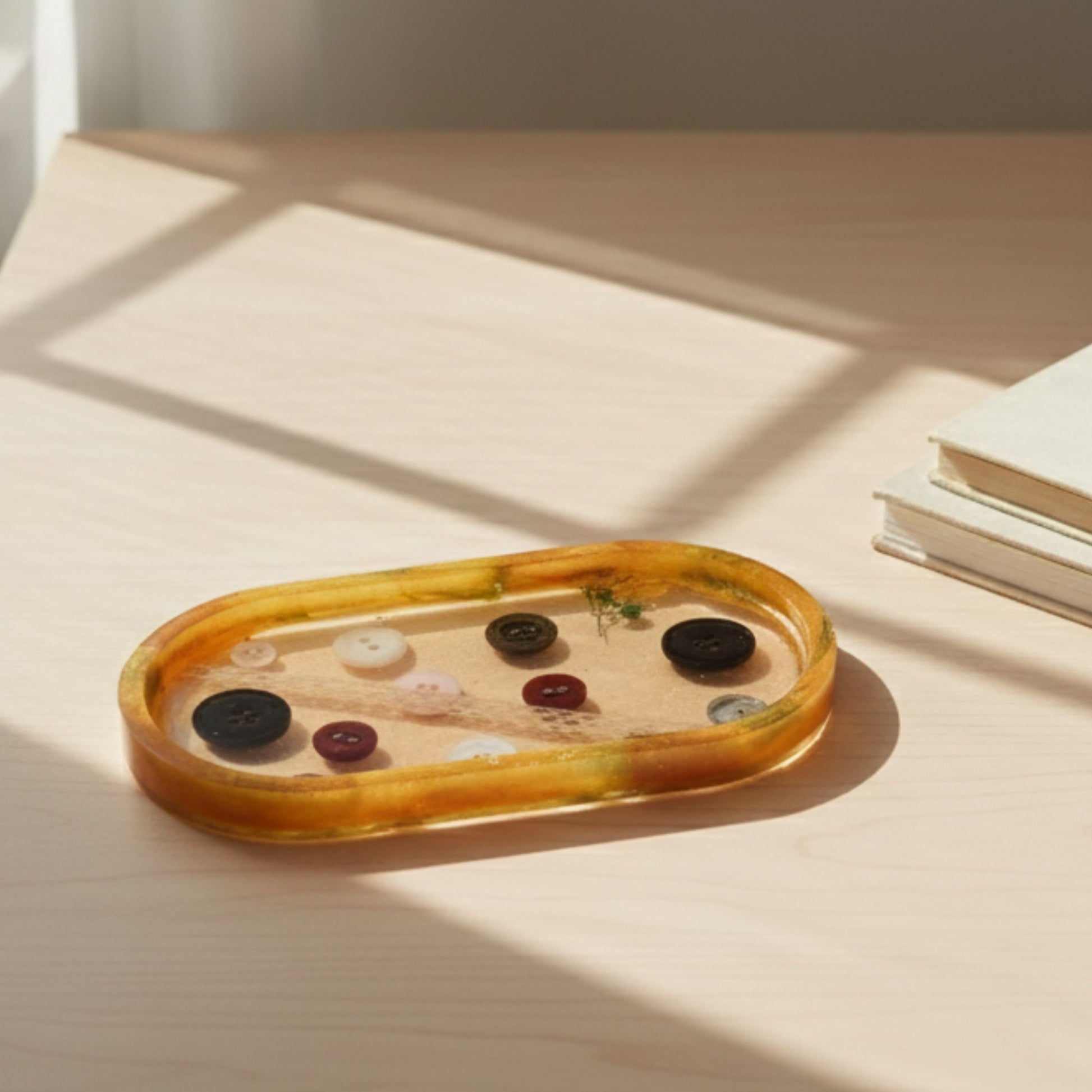 Vide-poche résine couture boutons vintage orange fleurs - Plateau ovale 18cm créatif - Accessoire artisanal unique fait main